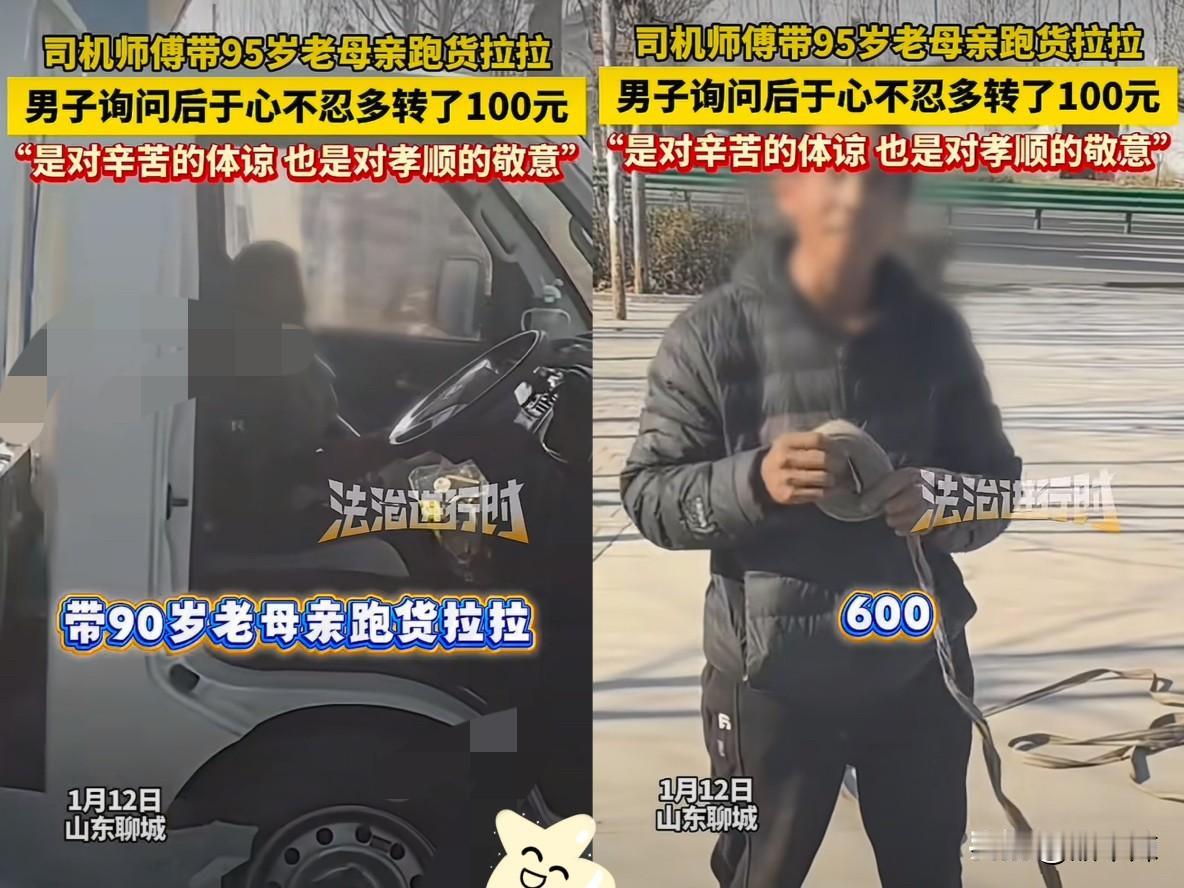 “活该发财!”山东聊城一男子找货拉拉拉货,卸完货后准备给司机结运费,不料,一眼瞥见副驾缩着位95岁老奶奶,一问才知是司机的老母亲。 司机离婚后独自扛起养家和尽孝的担子,怕老人独自在家有闪失,跑遍全城拉货都把母亲带在身边,车上只备着热水和硬邦邦的馒头。 货主听完没多说一句,600元运费直接转了700,临走还把没拆封的蛋黄派塞给老人。 这哪是简单的多给钱,分明是成年人之间最戳心的体谅!司机扛着生活的重压仍坚守孝道,货主看见他人难处便主动伸手,这种双向的善意,才是能焐热整个社会的光! 生活里的暖从来不是惊天动地的大事,而是你懂我的难,我予你一份甜!