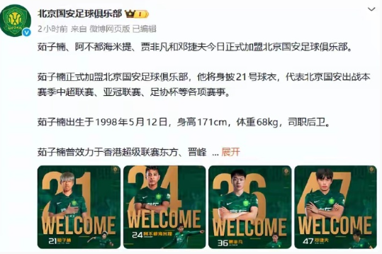 北京国安官宣茹子楠、邓捷夫等四名本土新援加盟,同时续约池忠国、王刚两名老将。新援中三人缺少即战力,邓捷夫偏年轻、阿不都海米提有技术短板,贾非凡适配性存疑。球队遭王子铭、张源离队,外援引援未落地,球迷吐槽引援力度不足,怀念前管理层李明时期。