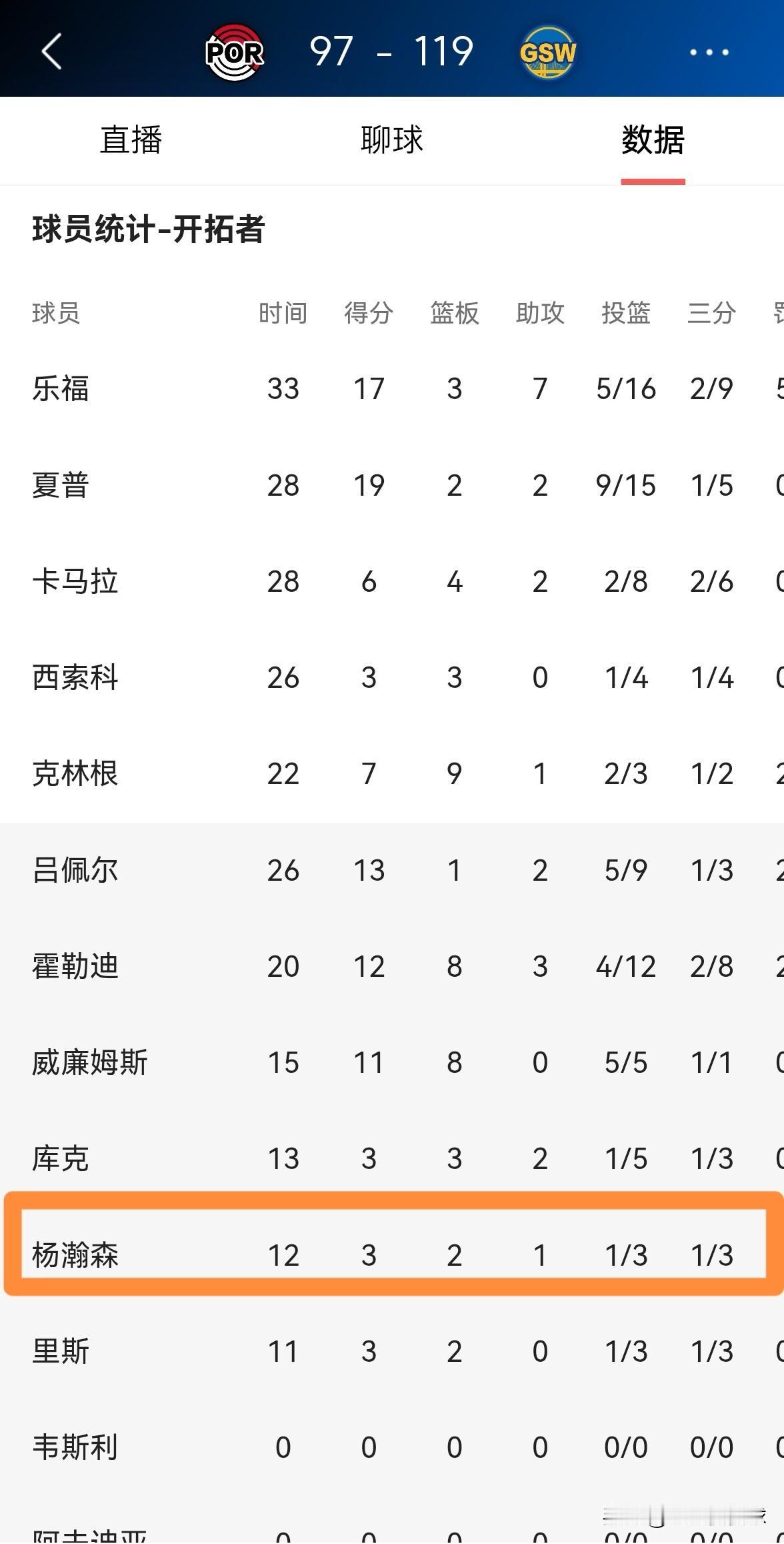 我强烈建议开拓者主帅斯普利特弃用杨瀚森!在今天开拓者客场以97:119惨败于勇士的比赛中,杨瀚森替补出战12分钟,三分球3中1得到3分2篮板1助攻,还有1次失误,他的场上正负值为-9。对于杨瀚森总是飘在外线投三分的选择,我真是忍无可忍了,与其看杨瀚森在场上浪费自己的天赋,倒不如建议斯普利特教练弃用杨瀚森。 毫不夸张的说,如果杨瀚森在接下来的比赛中继续飘在外线投三分,那么他一定会惨遭NBA的淘汰,因为开拓者并不需要杨瀚森这样的软中锋。