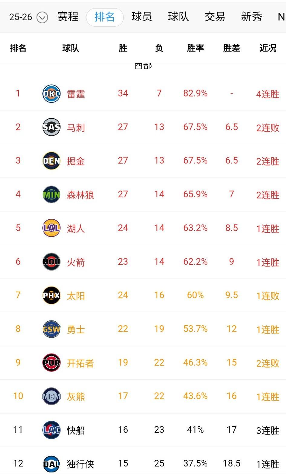 热火战胜太阳,湖人松了口气,火箭重新回到西部第六的位置。赢球才是保住位置的最好办法。 西部前八中除了马刺输给雷霆、太阳输给热火,其它球队都胜了。所以排名基本都没动。 约基奇休养并没影响掘金赢球,大概率还会反超马刺跃居第二。
