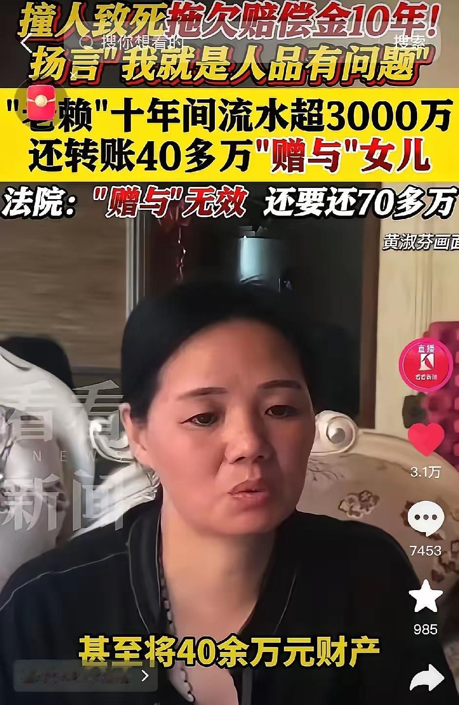 天亮了!唐山教科级老赖黄淑芬终于被制裁了,开车撞人致死赔偿金10年不给,终于在2025年底,法院判定她赠与女儿的40万无效,每个月退休金到账就会被扣走,但是到如今还是欠他们69万。 2015年她刚拿驾照3个月就逆行撞飞赵香斌,只潦草垫了2.6万治疗费就彻底失联,一句没钱,把本就普通的赵家瞬间推入灭顶深渊。 为什么老赖多?这就是原因,明明有钱十年了都执行不了,老赖的诉讼申请比受害人还多,快成笑话了;有关部门该反思一下。 我国法律对这样子的无耻之人缺乏必要的手段,十年了啊,才给40万,不说其余的四十多万,就这四十万,相当于十年前的二十万吗? 退休金账户为什么不能查封止付?她女儿如不执行生效法律文书,一并起诉。 这唐山法院的问题执行不力,平时人家正常做生意交易的资金都可以冻结,现在都十年不冻洁她银行存款还在大额转账,名下房产不拍卖 这唐山老赖事件,十多年了多次上新闻,是对法律的亵渎,对社会的污染,法院有责任! 迟到的正义还能算是正义吗?当时人从一个小伙子变成了中年人还没等到执行的结果,这半辈子都花在这件事上了。 上一次看这新闻我还没结婚,再看到2025年才判决有进展,关键还没拿到钱,这8年多时间万一黄某挂了,或者赵勇挂了,这事就结束了吧?太难了。 空有判决,没有执行,这样的典型老赖,居然那它没办法,简直就是对社会和法律的巨大嘲讽,以后大家都耍赖得了,反正也没什么严重后果。 网友建议:我一招就行了!每天早晚让老赖在看守所吃饭睡觉!白天一天不用管他,让他出去挣钱!但是早晚必须回看守所!用不了一个月马上交钱!没钱也能出去借!要是每天晚上不回来抓到后鞭刑100下,这一百下最少可以让他躺平3个月不能起床。这个方法不信就试试! 广西的朋友表示:我堂哥给黄某大排档供应猪肉10年货款约115万,至今还有65万没有结清,赖账长达10年了。2023年跟其他商家一起诉他,第一个月还了1万,第二个月接着又赖账不还了。他把所有的财产和不动产全部过户给子女了,他账户一分钱都没有。拿他没办法,自认倒霉!