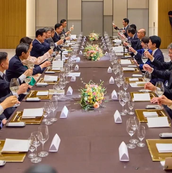 韩国总统李在明访问日本,日本为其举行欢迎宴会,参加宴会的每个人前面都摆了三个酒杯,给人感觉要大喝一场的感觉! 李在明后面站了两名服务生,一男一女一人抱着一个酒瓶子,这是生怕李在明喝的不到位。李在明的妻子坐在他的右边一起参加了宴会,而日本首相高市早苗的丈夫却缺席了这次宴会,防长小泉进次郎则和韩国总统李在明夫人对位。