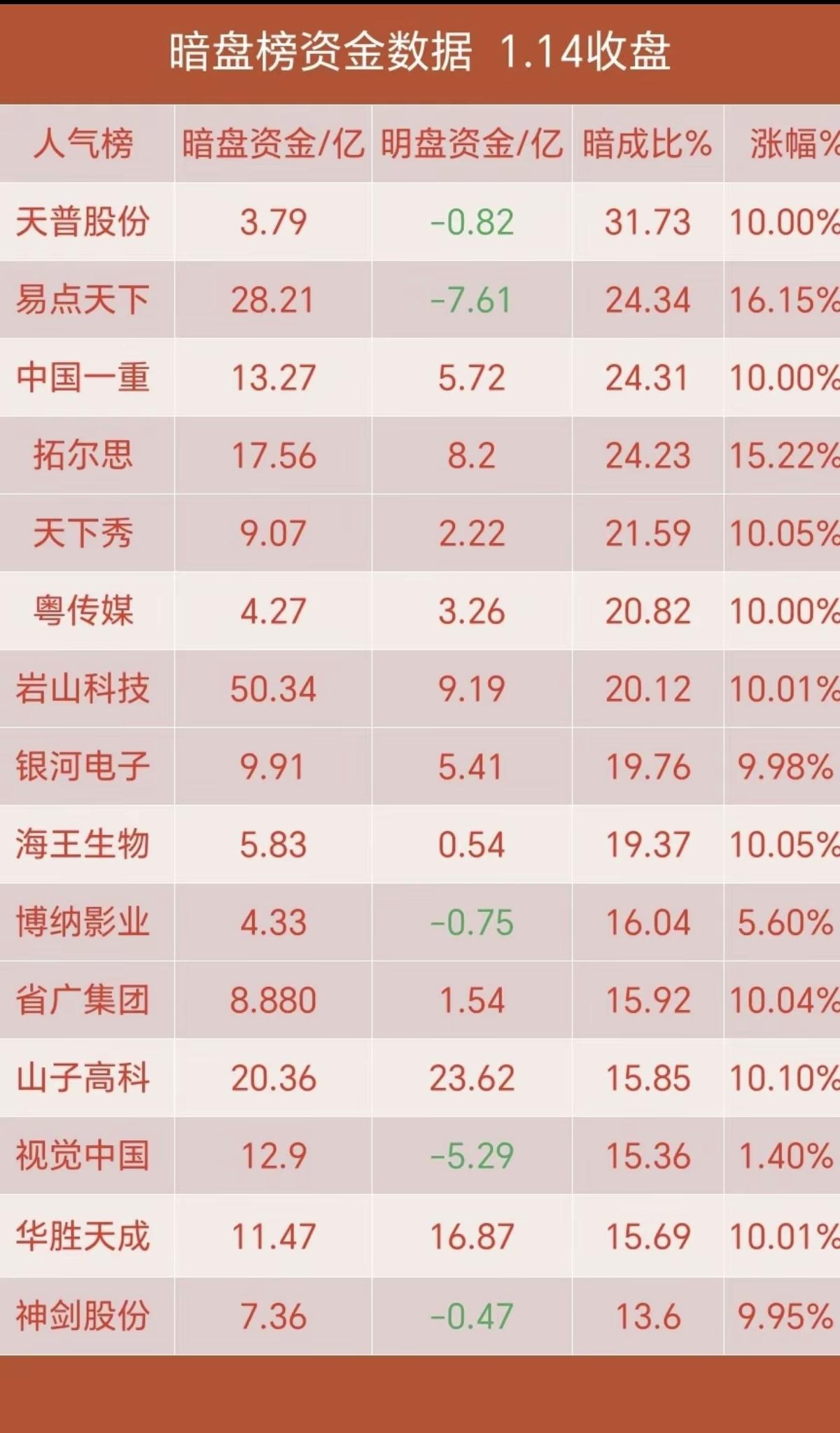 1.14周三 暗盘资金 抢筹出逃个股榜! 资金抢筹: 1.互联网软件,通信服务 2.多元金融,互联网金融 3.软件开发 4.风电设备,光伏设备 资金出逃: 保险银行等权重蓝筹股下跌,控制节奏