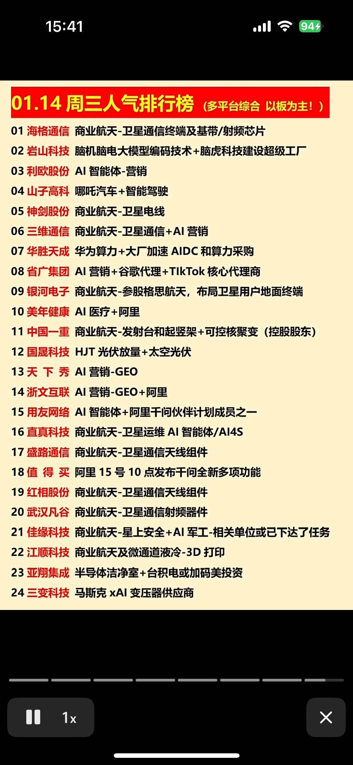 1月14日周三人气排行榜揭晓! 🔥📈📈📈 商业航天与AI技术领跑,脑机接口、卫星通信、智能驾驶及光伏创新活跃,医疗营销多领域融合 商业航天与AI技术领跑人气榜,卫星通信、脑机接口、智能营销成热点,多家企业布局创新领域,科技融合加速产业升级。