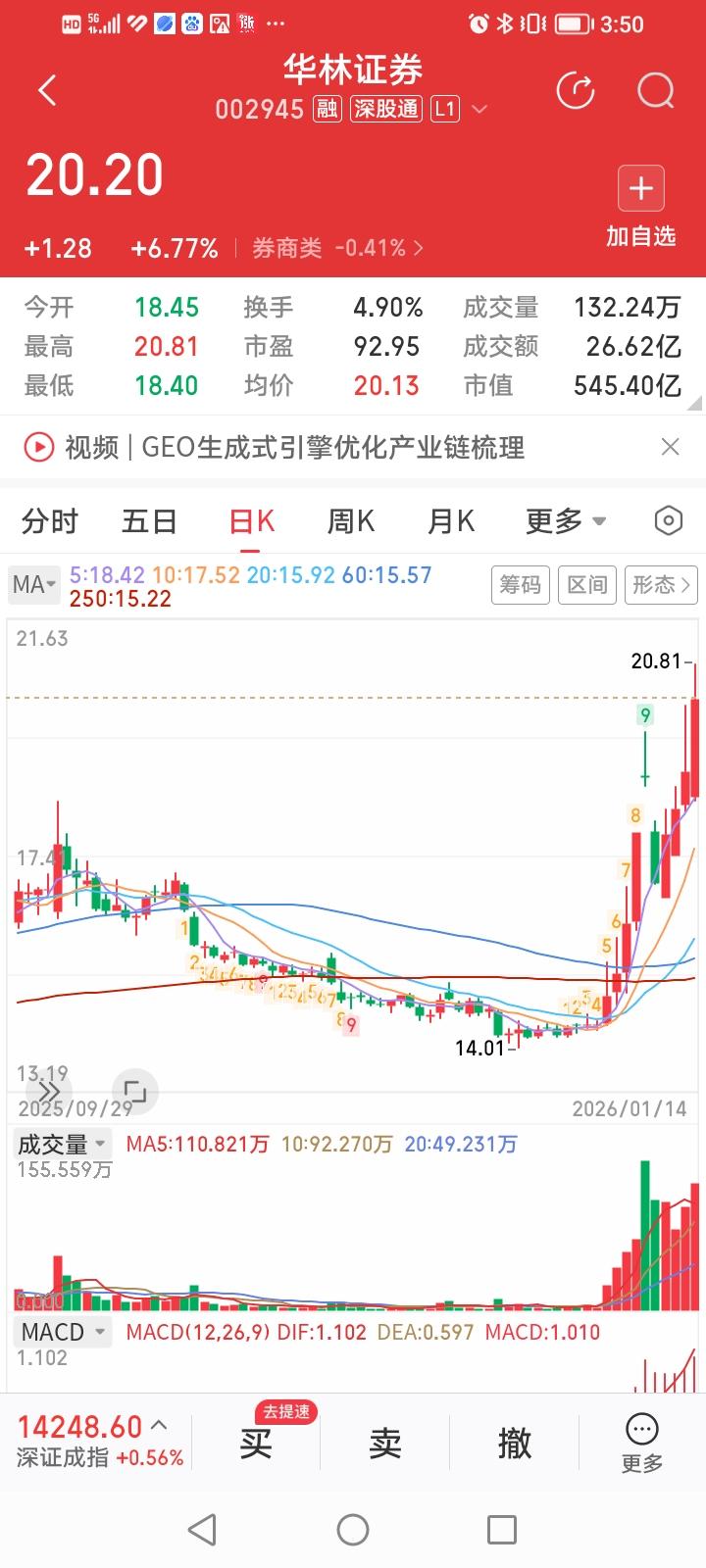 什么情况?华林证券似乎成了打不死的小强!今天收盘继续大涨6.77%,收盘价和最高价继续创出6年来的新高。而且上午收盘时股价还强势封死涨停。 下午一开盘,华林证券受某些利空因素影响,股价打开涨停板,但依然走势稳健,收盘大涨6.77%。 但示强者可能其实并没有那么强,它可能只是摸透了有些小散的慕强心理,表现出一副强者恒强的姿态,勾引某些喜欢追涨杀跌的跟风炒作而已。 这种估值偏高的题材股炒作,股价走势翻云覆雨,今天涨停,明天跌停的,咱站的远远的,看看戏好了。