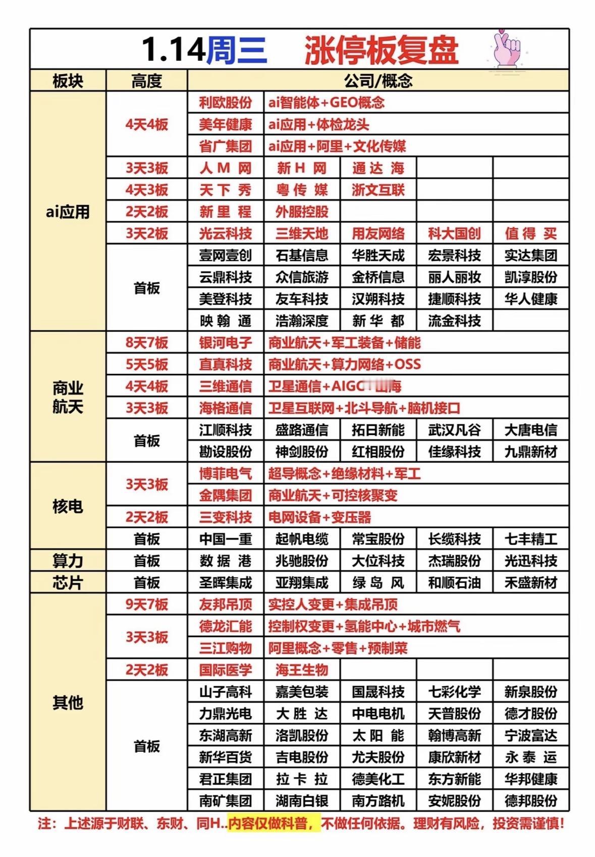 1.14周三涨停板复盘,带你揭秘热门板块和概念股! AI与商业航天概念股爆发,多只个股连板涨停,市场热度高涨,投资需谨慎。 AI概念股持续爆发,商业航天与算力板块活跃,多只个股连板涨停,市场热点轮动加速。投资需谨慎。