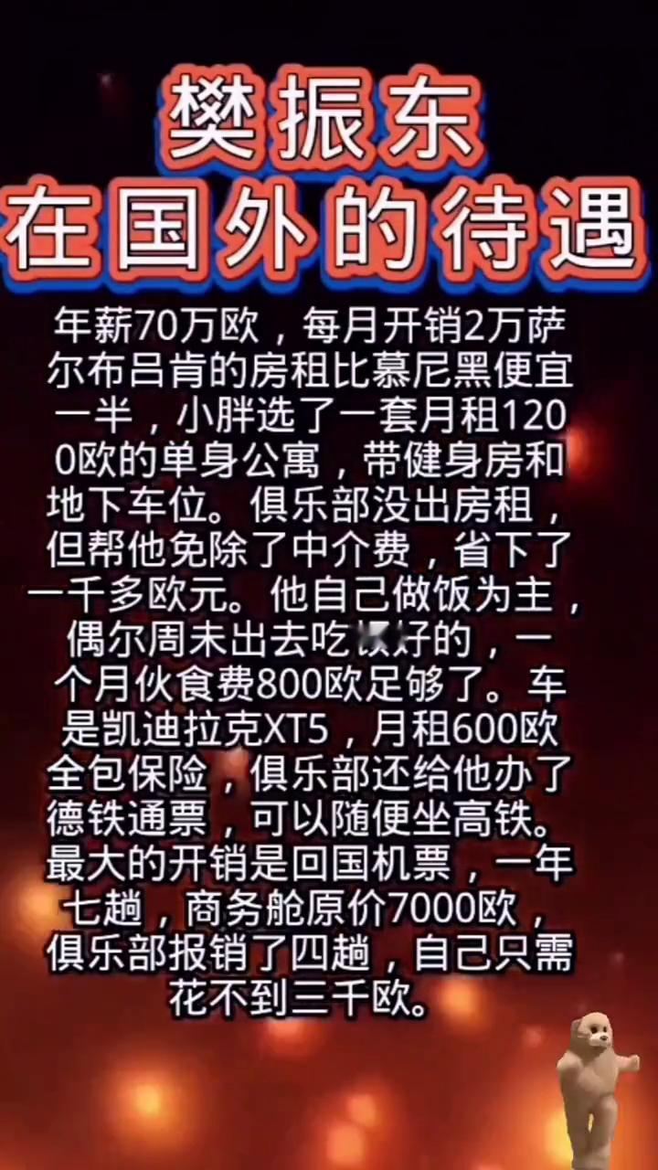 樊振东在国外的待遇。 年薪70万欧,每月开销2万。萨尔布吕肯的房租比慕尼黑便宜一半,小胖选了一套月租120欧的单身公寓,带健身房和地下车位。俱乐部没出房租,但帮他免除了中介费,省下了一千多欧元。他自己做饭为主,偶尔周末出去吃顿好的,一个月伙食费800欧足够了。 车是凯迪拉克XT5,月租600欧,全包保险,俱乐部还给他办了德铁通票,可以随便坐高铁。最大的开销是回国机票,一年七趟,商务舱原价7000欧,俱乐部报销了四趟,自己只需花不到三千欧。