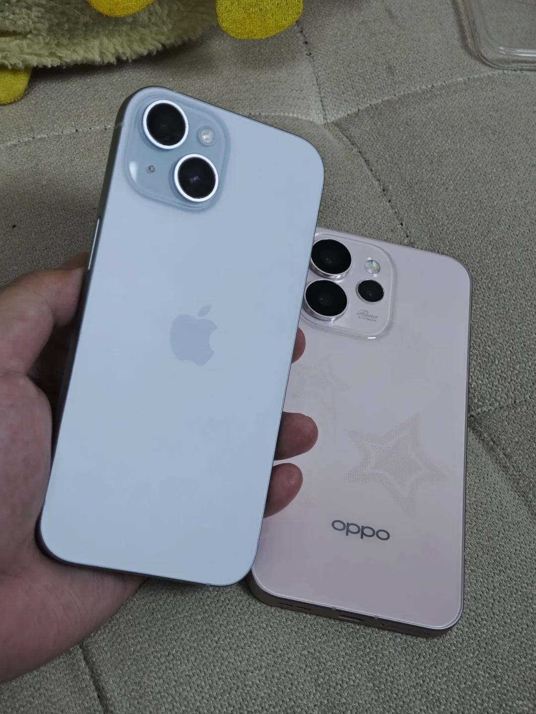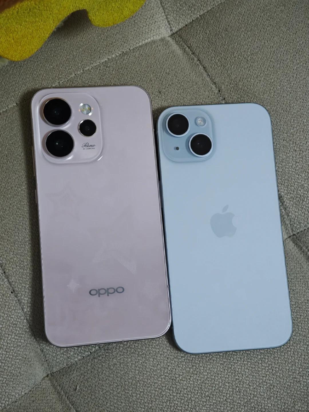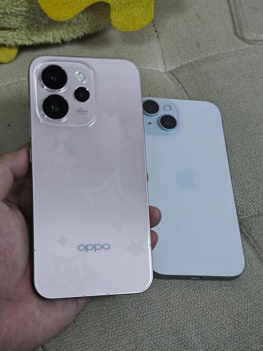 有没有感觉,粉色和蓝色很搭? 蓝色的iPhone,粉色的OPPO Reno15,放在一起还挺般配的 苹果就是经典设计,蓝色款很清新,Reno15是有点果果的,这个新配色还很嫩,两款颜值都好高哦 要你选的话,你选哪一款?