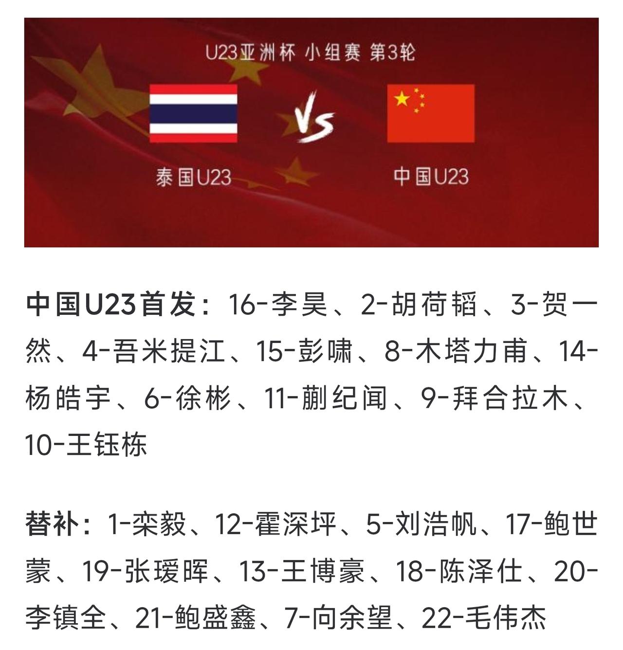 亚洲杯,蒯纪闻首发!国足u23今夜19点30分,迎战泰国队,打平即可出线。这种情况下,国足选择变阵,从此前的532变为442,增加一个中场球员,确保控制节奏,争取尽快进球,拿下胜利! 前锋依然是王钰栋和拜合拉木