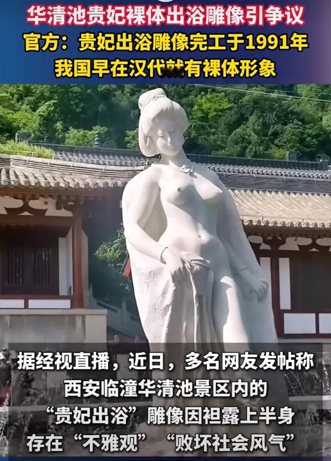 华清池“贵妃裸浴像”突然引发争议,着实让人忧虑一些人的眼界和认知。这座雕像由知名雕塑家潘鹤于1991年完成,并坐落于西安临潼华清池景区,文化背景取自唐玄宗为杨贵妃建造的御用汤池,在白居易长恨歌中也有相关场景的描绘。就是这样一座艺术氛围和文化思想双双拉满的雕像,关键还矗立在景区30多年。 今天居然有人用“败坏社会风气”、“袒胸露乳不雅观”来形容这一文化作品,不知道该说当今的某些人思想还不如30年前的开放,还是该说这些人的思想过于龌龊,看到裸露在外的身体就只能想到下半身的那点事? 不管怎样,都希望西安这个十三朝古都能顶住压力,别被某些别有用心之人给嚯嚯怕了,就让好端端一幅艺术作品搞画蛇添足的举措。否则那些吃饱没事找事的人过两天就消停了,却可能让一个兼具承载历史和时代开放价值的艺术品蒙羞。该感到羞耻的是那极个别人,不是这幅雕像,更不是西安。