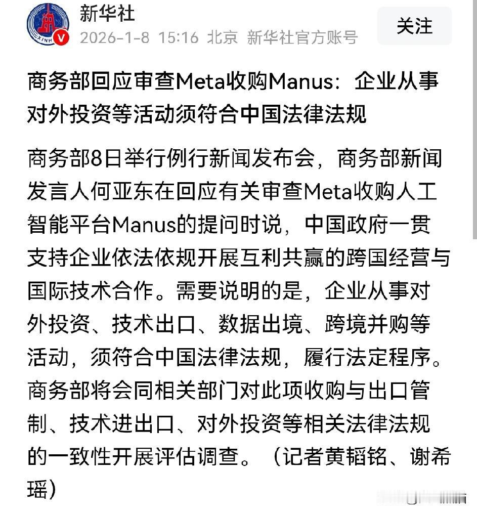 机关算尽,这家曾受人追捧的本土企业,拿着靠国内资源迅速成长后要给外企做嫁衣,其实早就被有关部门盯上了。 这个扎根于国内的Manus,一度被国内市场追捧,但是管理团队为了套现,不顾核心技术、人员积累都依靠国内的事实,认为把公司迁到新加坡就可以放飞自我,哪有那么简单的。 1月8日,商务部及时摁住了这个收购案,因为该交易涉及核心技术跨境转移违规,这次强力的监管,也让机关算尽的团队栽了跟头。