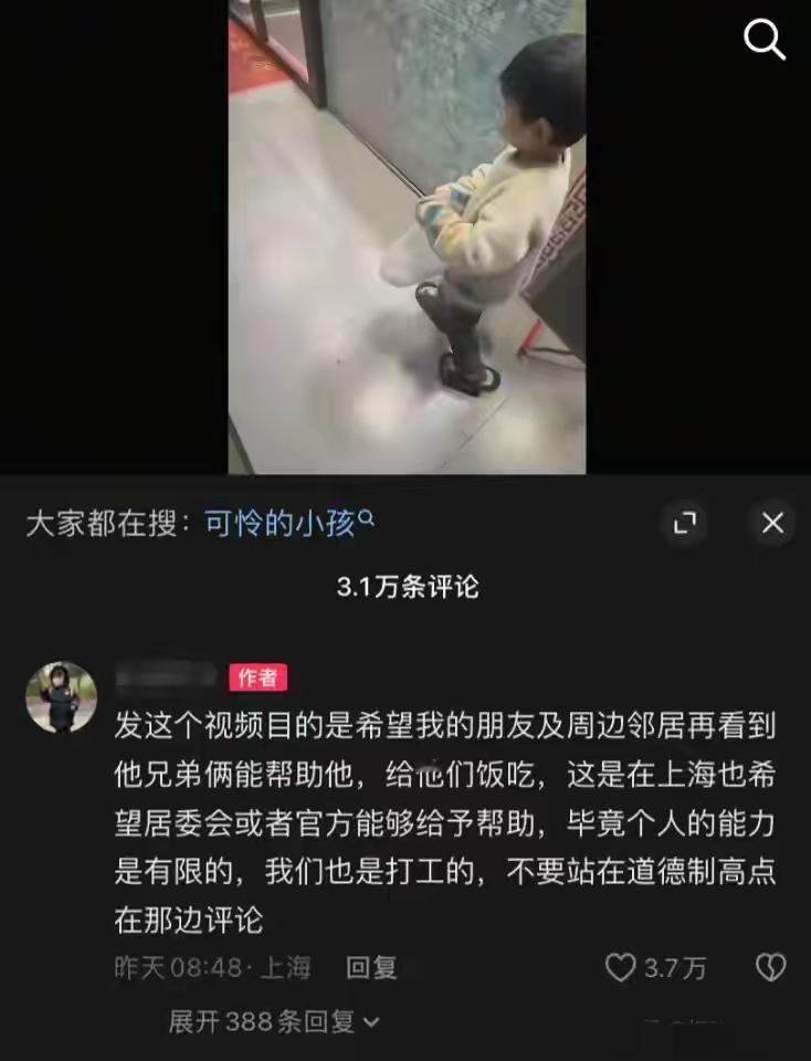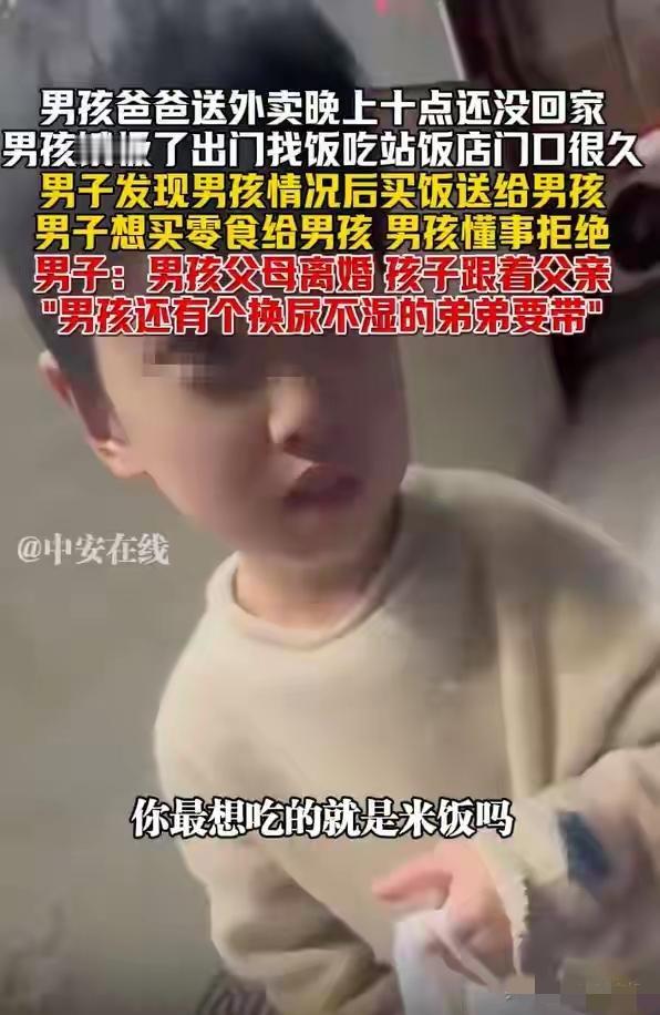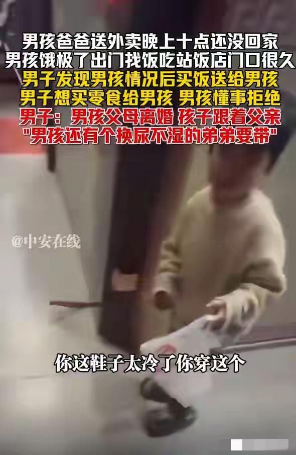 1月11日深夜,上海街头,单亲外卖员的五六岁儿子因饿出门寻食,穿着单薄毛衣、露趾凉鞋的他拒要零食,直言“就爱吃饭”。男孩不仅懂事克制,还在家照顾年幼弟弟,其父亲为生计仍在外奔波,让人心疼不已。 网友评论: 送孩子回家的年轻人是个好人。祝你工作顺利,万事如意,幸福健康。好事做下去。也希望平台多推送这样的文章。希望平台不要把那个破明星的八卦乱码七糟的天天往外推。 父亲可以一大早出门前煮好一锅粥,把粥装入3个保温饭盒里,让孩子早,中,晚吃。四十年前我舅就是这么做的 太让人心酸,孩子父亲太拼了,孩子小太懂事了,不要零食,这位善良男子汉,是好人,希望社区给予帮助,使孩子得以人温暖。 看了这篇文章,就知道大家为什么对闫某反应激烈……