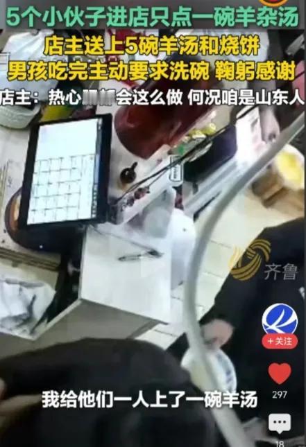 济南一家羊汤馆里,来了5个小伙子,居然只点了一碗羊杂汤!老板一看这阵仗,心里估摸着就明白了:这几个孩子,估计是手头有点紧,或者刚出来打拼,想省点钱。这哪能行?咱山东人啥性格?实在!好客! 看不得这个! 老板没多问一句,转身就往后厨走,回来时端着的那碗羊杂汤,分量比平时足足多了一倍,碗沿堆着满满的羊杂、肉片,奶白的汤还冒着咕嘟咕嘟的热气。 他把碗往桌子中间一放,又顺手从柜台下拎出一摞刚出炉的热烧饼,还端来一小碟清爽的凉拌小菜,一股脑全推到小伙子们面前,动作麻利还带着股藏不住的爽快。 几个小伙子瞬间愣住了,你看看我我看看你,脸唰地红了,局促地搓着手连忙摆手。领头的小伙子声音都有点发紧,说老板不用这样,他们就点了一碗,不用加这么多,说着还想把多出来的羊杂往回拨。 原来他们是刚从老家来济南打拼的毕业生,跑了半个月找工作没着落,身上的钱快见底了,舍不得多花钱,才凑钱点一碗羊杂汤分着吃,只求能垫垫肚子扛过下午的面试。 老板一听这话,嗓门一下子亮了,带着山东人特有的豪爽劲儿,说出门在外谁没个难的时候,不就是一碗羊汤几个烧饼,值不了几个钱。 吃饱了才有力气跑面试闯事业,总不能饿着肚子硬扛,那哪叫打拼,那是熬垮身子。他边说边把烧饼掰成小块,挨个分到小伙子手里,还指着汤锅说,汤不够随时喊他,管够,小菜也随便续,不用跟他客气。 小伙子们捏着温热的烧饼,眼睛都有点湿润,泡着羊汤大口吃起来,嘴里不停念叨着谢谢。他们说长这么大第一次来济南,本来因为找工作不顺心满肚子沮丧,没想到能遇到这么实在的老板,心里一下子暖得发烫。领头的小伙子还特意掏出手机记了店里的门牌,说等他们找到工作稳定下来,肯定带着所有朋友来光顾,到时候要点满满一大桌,好好补回来好好谢谢老板。 老板笑着摆手,说不用谢,都是小事儿。他在这开羊汤馆十五年,见过太多来济南打拼的年轻人,有顺风顺水站稳脚跟的,也有磕磕绊绊四处碰壁的。 但凡遇到手头紧的,他总愿意多搭把手,要么加量要么送吃食,从来没计较过成本。有人说他傻,做生意哪有这么不计较的,多给的羊杂和肉都是实打实的成本,送的烧饼小菜也不是大风刮来的,可他总说,钱是赚不完的,人情味儿才最金贵,能帮一把是一把,心里舒坦。 这几个小伙子后来真的兑现了承诺,找到工作的第一个周末就带着一群朋友来了店里,点了七八大碗羊汤,还有各种配菜,把小桌子摆得满满当当。他们拉着老板唠了半天,说当初要是没那碗分量超足的羊汤,没老板那句暖心的话,他们说不定早就收拾行李回老家了,是那碗羊汤的温暖,给了他们留在济南继续打拼的勇气。 其实不止这家羊汤馆,济南街头巷尾的小馆子,大多都藏着这样的温暖。山东人的好客从来不是挂在嘴边的口号,是刻在骨子里的本能,是看到别人难处时毫不犹豫的伸手,是不图回报的实在。反观现在有些商家,只顾着盯着盈利,多给一勺汤都心疼,更别说主动帮衬陌生人,这样的对比,更显这份烟火气里的人情味有多难得。 我们总在感慨陌生人之间的信任越来越少,可这样的小事却一次次告诉我们,温暖从未缺席。一碗羊汤、几个烧饼,不值多少钱,却能在人最窘迫的时候,撑起一份体面,给人一份前行的希望。这不是施舍,是平等的尊重,是真诚的善意,这样的善意,能让人记住一座城的温度,也能让人愿意为这座城拼尽全力。 换作是你遇到这样窘迫的年轻人,会愿意伸出援手吗?这样不图回报的陌生人善意,是不是比任何精致的营销都更能打动人?说到底,不管是做生意还是做人,真诚永远是必杀技,实在永远最动人,这份藏在市井烟火里的温暖,才是生活最该有的样子,才是一座城最亮眼的名片。 各位读者你们怎么看?欢迎在评论区讨论。