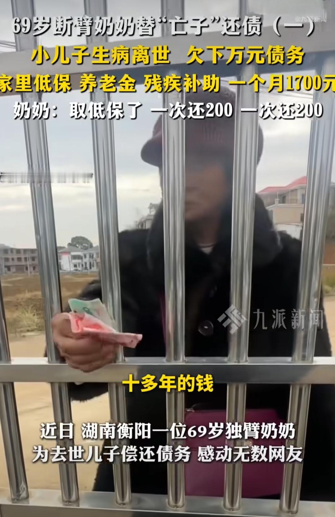 湖南衡阳有位69岁的黄奶奶,她这辈子过得特别不容易,六岁那年左臂被砖头砸断,打小就只能靠一只右手过日子,可就是凭着这只手,她辛辛苦苦把两个儿子拉扯大。谁知道命运又跟她开了个大玩笑,小儿子从小体弱多病,后来更是常年受哮喘折磨,好不容易熬到四十多岁,还是没能扛过去,撒手人寰了。 送走小儿子后,黄奶奶还没从悲痛里缓过神,就偶然听村里人说,儿子生前为了看病买药、补贴家用,跟不少亲友邻里借过钱。她心里咯噔一下,儿子从没跟家里提过欠债的事,也没留下账本借条,可黄奶奶觉得,欠了人家的钱就得还,这是做人的本分,不能让儿子走了还落个赖账的名声,更不能让孙子在村里抬不起头。 之后的日子里,黄奶奶就挨家挨户去打听,问谁还记得儿子借过钱、借了多少,一笔一笔都记在心里,最后算下来,总共欠了一万多块。可黄奶奶家条件特别差,老伴儿八十多岁了,一身病常年要吃药,大儿子在外头靠扛水泥打零工糊口,家里就靠她的低保、养老金还有残疾补助过日子,三样加起来一个月才1700块钱,这点钱要养活老两口,还要攒钱还债,难上加难。 可黄奶奶没打退堂鼓,她想着省一点是一点,平时自己种点菜、养几只鸡,很少买新衣服,穿的大多是别人送的旧衣裳,把省下来的低保钱攒着,每次凑够200块就赶紧给人家送过去。有一次,她走了好几里山路,找到儿子以前孩子的校长,递上150块钱,校长都懵了,压根不记得十年前借过这笔钱,可黄奶奶记得清清楚楚,说啥都要还。 就这么一笔一笔地还,一块一块地攒,黄奶奶慢慢还了9000多块,眼看就要还清了。她总跟人说,别人的钱也不是大风刮来的,都是血汗钱,人家愿意借钱给儿子是情分,她去还钱是本分,不把钱还完,心里总不踏实。 后来黄奶奶替子还债的事被传开了,好多网友都被她的诚信打动,纷纷给她捐钱捐物,当地的志愿者和村干部也常来看望她,给她送慰问品。黄奶奶收到这些好意特别感动,还总说不好意思,把收到的捐款也都拿去还债了。 现在黄奶奶的债快还完了,她心里的担子也轻了不少,盼着等钱都还完了,就能安安稳稳跟老伴儿好好过日子,不辜负那些帮过她的人,也对得起自己的良心。替亡子还债断臂奶奶说已还9千元69岁断臂奶奶替亡子还债
