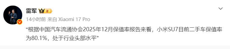 雷军:小米SU7二手车保值率80% 【大河财立方消息】1月14日消息,雷军在社交平台发文称,根据中国汽车流通协会2025年12月保值率报告来看,小米SU7目前二手车保值率为80.1%,处于行业头部水平。