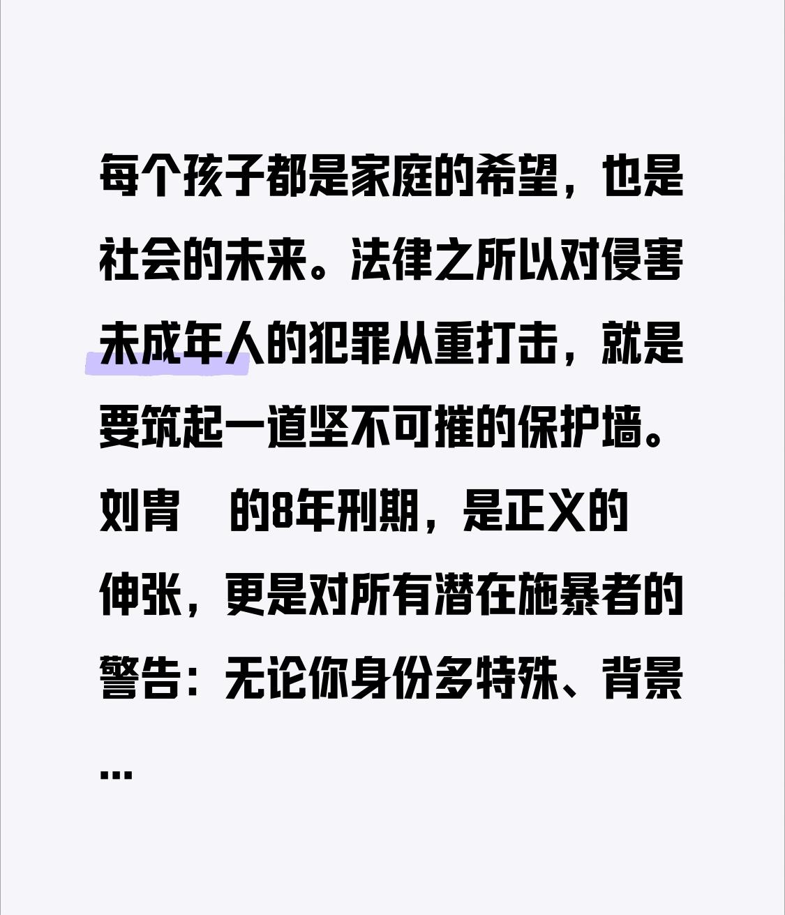 震怒!90后医生强奸2名幼女,曾任检察官的父亲当庭辩护,二审轻判后再审改判8年 家人们刷到这则判决通报,气得浑身发抖!湖南永州90后医生刘胄赟,利用网络结识两名未满14岁的幼女,多次在酒店发生性关系,犯下令人发指的强奸罪。更让人无法接受的是,他的父亲——曾任蓝山县检察院副检察长的刘志军,竟亲自为儿子担任辩护人,试图脱罪,而案件的审理过程更是一波三折,暴露的问题太值得深思! 谁能想到,身披白大褂、本该救死扶伤的医生,会把魔爪伸向懵懂的未成年少女?根据法院审理查明,刘胄赟在2022年至2023年间,通过网络结识12岁的廖某某和13岁的来某某,用暧昧聊天获取信任后,先后多次在酒店与两人发生性关系,其中仅对廖某某就实施了三次侵害。要知道,我国法律明确规定,与未满14周岁幼女发生性关系,无论对方是否“自愿”,均构成强奸罪,且要从重处罚! 可案件的第一个转折点,让网友炸开了锅:身为前检察官的父亲刘志军,在庭审中竟作无罪辩护,声称儿子是“未婚青年与被害人疑似网恋”,还质疑警方询问被害人的录音录像存在瑕疵,要求排除关键证据。更离谱的是,永州中院二审时,竟采纳了“未使用暴力、无严重后果”的说法,将一审的8年有期徒刑改判为6年,这一判决瞬间引发全网质疑——难道身份特殊就能法外开恩?难道幼女的权益就如此廉价? 好在正义从未缺席!在舆论监督和司法纠错机制下,永州中院院长发现案件判决不当,启动再审程序。2026年1月14日,再审宣判终于给出公正结果:撤销二审轻判,维持一审8年有期徒刑的判决!法院明确指出,刘胄赟奸淫两名幼女,其中一人多次受害,完全符合强奸罪从重处罚的情形,二审量刑明显不当,必须予以纠正 。 这起案件最让人愤怒的,不仅是医生违背医德、践踏法律,更是父亲利用专业法律知识为儿子的恶行开脱。作为曾任分管刑事检察的副检察长,刘志军不可能不懂“奸淫幼女从重处罚”的法律规定,却试图用程序争议模糊犯罪本质,这种“知法犯法”的行为,比犯罪本身更伤人心。 更值得警惕的是,这起案件暴露了未成年人网络保护的巨大漏洞。凶手通过网络结识幼女、诱骗线下见面,而两名被害人的家长竟长期不知情,直到案发才如梦初醒。最高法早已明确,对性侵害未成年人犯罪坚持“零容忍”,哪怕没有暴力胁迫,只要侵害事实成立,就必须依法严惩 。 每个孩子都是家庭的希望,也是社会的未来。法律之所以对侵害未成年人的犯罪从重打击,就是要筑起一道坚不可摧的保护墙。刘胄赟的8年刑期,是正义的伸张,更是对所有潜在施暴者的警告:无论你身份多特殊、背景多深厚,只要敢伤害孩子,就必将付出沉重的法律代价! 你怎么看待这起案件?支持对侵害未成年人的罪犯从重处罚吗?评论区说说你的看法,一起为孩子撑起安全的天空!愿每个孩子都能在阳光下成长,愿正义永远不会迟到!