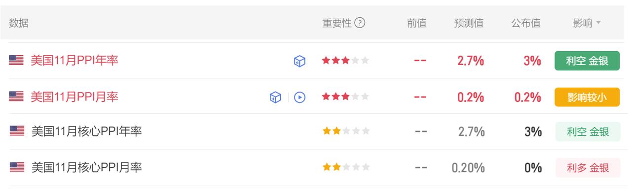 今晚多项经济数据公布。 首先美国11月PPI年率 3%,市场预期2.7%。 其次美国11月PPI月率 0.2%,预期0.2%。 最后美国11月核心PPI年率 3%,预期2.7%。 还有美国11月核心PPI月率 0%,预期0.20%。 这几项有利多金价,也有利空金价的, 数据公布以后,短线下挫后快速反弹,对黄金的影响十分有限。