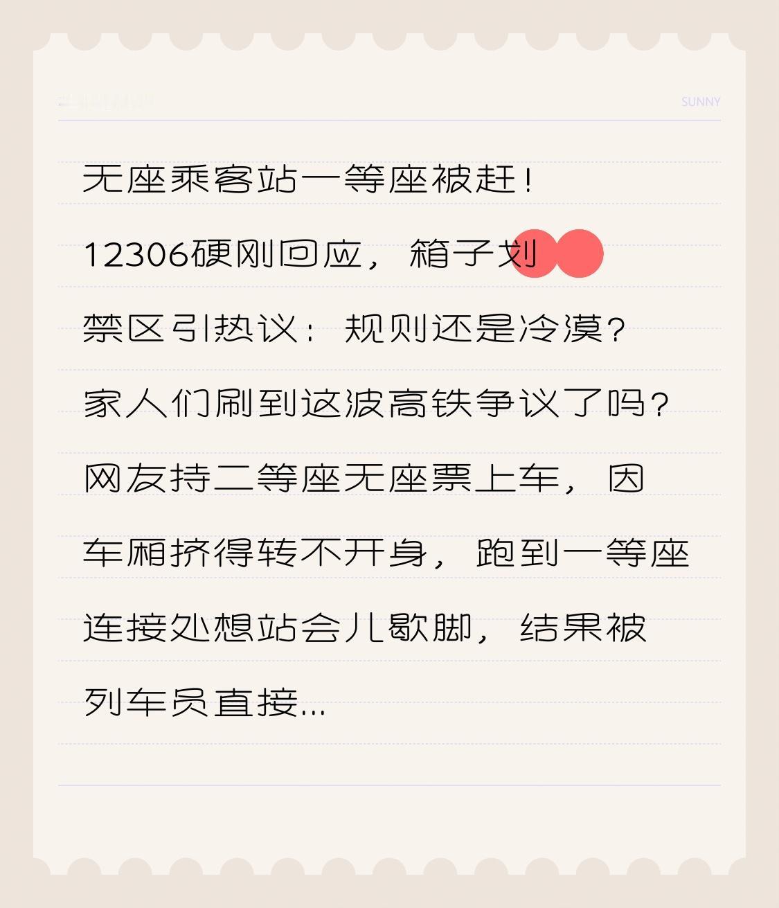 无座乘客站一等座被赶!12306硬刚回应,箱子划禁区引热议:规则还是冷漠? 家人们刷到这波高铁争议了吗?网友持二等座无座票上车,因车厢挤得转不开身,跑到一等座连接处想站会儿歇脚,结果被列车员直接劝离,甚至当场放倒绿色箱子划出“禁站区”!这事冲上热搜后,12306官方硬刚回应:无座票仅限二等车厢使用,严禁在一等座区域滞留,想进必须补差价! 一边是无座乘客的委屈:花和二等座一样的钱,站得腿发麻,一等座明明有空位和宽敞过道,站会儿又不影响谁?另一边是一等座乘客的不满:花贵50%甚至翻倍的钱买票,图的就是安静宽敞,凭啥要被随意占用权益?网友直接吵成两大阵营,争议的核心到底是规则至上还是不近人情? 其实这事儿的转折点,根本不是“人情”问题,而是有明确的法律依据!《铁路旅客运输规程》早就写得明明白白:持低票价席别车票的旅客,不能在高票价席别的车厢滞留 。12306客服也解释,一等座压根没设置无座席位,乘客买的不只是一个座位,还包括专属的空间、安静环境,甚至部分车次的免费饮品服务 ,允许无座乘客逗留,本质是侵害了付费者的合法权益。 更让人震惊的是,这不是孤例!深圳曾有男子持二等座无座票抢占一等座,面对座主和乘务员劝阻,不仅不让座还辱骂他人,最后被行政拘留5日。还有乘务员爆料,每逢节假日,一等座连接处总有无座旅客逗留,既影响他人进出,又破坏安静环境,劝阻时还常遭遇不理解甚至冲突。 但网友的吐槽也戳中了痛点:全国每年高铁无座票销量高达1.2亿张,占总票数的15%,每7个乘客里就有1个买无座票。他们花同样的钱,却要在拥挤车厢里站数小时,碰到高峰连过道都挤得难转身,看到一等座的空闲区域,难免想临时歇脚。有人质疑:规则能不能多些温度?空着的空间利用起来不好吗? 其实争议的核心从来不是“要不要守规则”,而是规则与情理的平衡。就像网友说的,飞机经济舱不能随便进头等舱,酒店普通房不能蹭五星套房,分级服务本是市场常态,“一分钱一分货”是基本公平。但铁路部门也可以优化服务细节:比如用座位上方的三色指示灯及时播报二等座空位信息,在无座区域增设带靠背的站立设施,让无座乘客的出行体验更舒心。 出门在外,谁都想有个舒心的旅程。无座乘客的困境值得关注,但权益主张得在规则框架内;一等座乘客的权益该被保护,也不妨多些换位思考。规则是公共秩序的基石,而情理是人与人之间的善意,两者从来不是对立的。 你支持12306的规定吗?有没有过买无座票的糟心经历?评论区说说你的看法!愿每一位旅客都能遵守规则,也愿公共服务能多些温度,让每个人的出行都能顺畅又舒心!