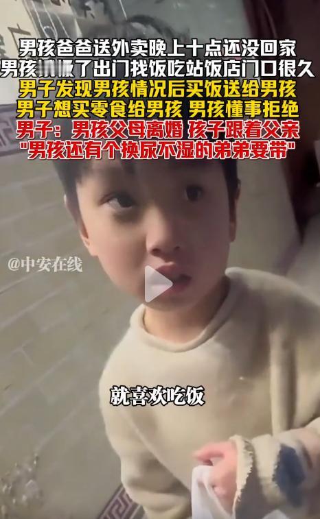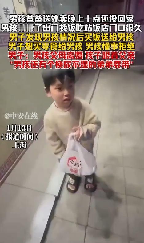“懂事的让人心疼!”1月13日上海,男孩爸爸送外卖晚上十点还没回家,男孩饿极了出门找饭吃,站饭店门口很久也不敢进去,男子发现男孩情况后提出买零食给他,男孩非常懂事的说不要零食,只想吃饭!原来男孩父母离婚,孩子跟着父亲"男孩还有个换尿不湿的弟弟要带"。 1月的上海夜晚,气温已经降到个位数,寒风刮在脸上带着刺痛感。男子下班路过街边的饭店时,注意到了门口这个特殊的小身影。 男孩穿着不算厚实的外套,小小的身子站得笔直,双手攥着衣角,眼睛一眨不眨地盯着饭店里食客桌上的饭菜,肚子饿得咕咕叫却始终没有踏进饭店一步,只是在门口来回徘徊,偶尔抬起头望一眼漆黑的夜空,像是在期盼着什么。 男子看着男孩单薄的身影在寒风中微微发抖,心里泛起一丝心疼,便放慢脚步走上前。感受到有人靠近,男孩下意识地往后缩了缩,眼神里带着一丝警惕和怯懦。 男子放轻了脚步,用温和的语气和男孩交流,过了好一会儿,男孩才慢慢放下戒备,小声说出了自己的处境。 原来男孩的父母已经离婚,他跟着爸爸一起生活,家里还有一个年纪更小、需要换尿不湿的弟弟。爸爸是一名外卖员,为了养活两个孩子,每天都要拼尽全力跑单,常常忙到深夜才能回家。 1月13日这天,爸爸出门送外卖后就一直没回来,男孩在家照顾了弟弟大半天,眼看天越来越黑,自己和弟弟都饿得受不了,才鼓起勇气独自出门找吃的。 他沿着街边一路找过来,看到这家饭店还亮着灯,就停下了脚步。可一想到自己身上没有钱,又不知道该怎么跟老板开口,只能怯生生地站在门口张望,希望能遇到好心人的帮助,又害怕被人驱赶。 了解到事情的原委后,男子心里五味杂陈,拉着男孩的小手就走进了饭店,让老板准备一份热气腾腾的饭菜。 等待饭菜的间隙,男子看着男孩冻得发红的小脸和小手,又想到这个年纪的孩子本该在父母怀里撒娇,却要承担起照顾弟弟的责任,心里更不是滋味。 他想起附近有家便利店,便打算给男孩买些零食和热饮,让他能多补充点能量,也能给家里的小弟弟带点回去。 当男子跟男孩说起要去买零食时,原本安静等待的男孩却连忙摇了摇头,小小的脑袋晃动得像拨浪鼓一样,明确拒绝了男子的好意。他低着头,小声解释自己不需要零食,有饭吃就已经很满足了。 看着男孩懂事的模样,男子心里更不是滋味,他能感受到,这个孩子不是不喜欢零食,而是过早地懂得了生活的艰辛,知道不能随便接受别人的东西,也明白每一份食物都来之不易。 很快,热气腾腾的饭菜做好了,男子把饭菜端到男孩面前,看着他狼吞虎咽吃饭的样子,眼眶有些发热。男孩吃得很快,却很斯文,没有浪费一粒粮食,吃完后还主动把碗筷整理好,对着男子深深鞠了一躬,轻声说了句感谢。 男子担心男孩一个人回家不安全,便提出要送他回去。路上,男孩忍不住抬头问男子,是不是爸爸送外卖很辛苦,为什么总是要忙到这么晚。 男子摸了摸男孩的头,告诉他人生活都不容易,爸爸努力工作都是为了让他和弟弟能过上更好的生活。男孩似懂非懂地点点头,小脸上露出了坚定的神情,说自己以后要更懂事,多帮爸爸照顾弟弟,不让爸爸操心。 送到男孩家门口后,男子才发现,他们住的地方是一间狭小的出租屋,屋里的陈设很简单,却收拾得干干净净。 房间里,一个还穿着尿不湿的小男孩正躺在床上乖乖地玩着玩具,看到男孩回来,立刻伸出小手发出咿呀的叫声。男孩快步走到床边,熟练地拿起旁边的尿不湿,小心翼翼地给弟弟检查,动作娴熟得不像一个孩子。 男子看着这一幕,心里深受触动,默默留下了一些钱和提前买好的生活用品,才转身离开。离开前,他特意叮嘱男孩,如果爸爸还没回来,有任何困难可以找邻居帮忙,或者给自己打电话。男孩认真地记下了男子的电话号码,又一次对着他鞠躬表示感谢。 其实在城市的各个角落,还有不少像这个男孩一样的孩子,他们在困境中努力成长,用小小的肩膀扛起不属于这个年纪的责任。 而陌生人的一句关心、一份帮助,就像寒夜里的一束光,能给他们带来温暖和力量。这份善意不仅能照亮孩子的童年,也能让整个社会变得更加温暖。 对此,你们有什么看法,欢迎评论留言~