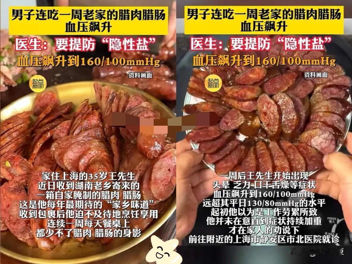 近日,上海,一男子收到老家的腊肉后,每顿饭都要吃上几口,结果过了一周,男子开始头晕乏力,口干舌燥,去医院检查后,才发现血压已经飙升,飙到160/100mmHg,头晕乏力口干舌燥,差点把身体吃垮! 这哪是解馋,分明是在啃“隐形盐炸弹”!腊肉为了保鲜防腐,含盐量远超鲜肉,50克就快顶半天的推荐盐摄入量,吃着香却在悄悄给血管加压。 不少人觉得自家熏的就放心,殊不知藏在肉纹理里的盐,才最让人防不胜防! 年味不能少,健康更得守!其实不用彻底戒掉,吃前泡一泡、焯个水,再搭配点高维C蔬菜,就能减少不少盐分和有害物质!
