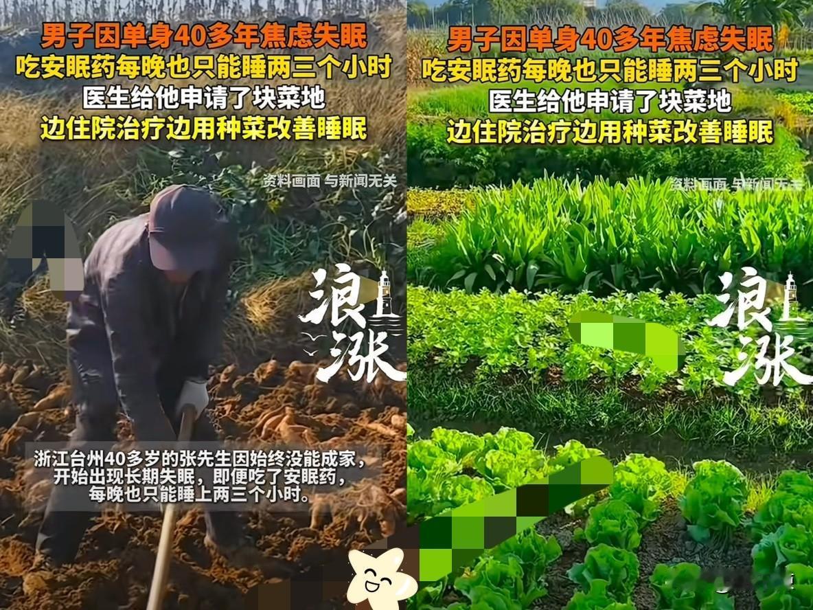 “离了个大谱!”近日,浙江台州,一40多岁男子因始终单身,每晚焦虑得睡不着,即使吃安眠药也只能勉强睡两三个小时,医生一招“给块地让他种菜”,竟彻底治好了他的失眠! 网友调侃“就是闲的”,这话还真没说错。人一旦空下来,大脑就容易钻进焦虑的牛角尖,而种地这种接地气的体力活,既能实打实消耗多余精力,又能让人专注于菜苗生长的小确幸,把胡思乱想的时间全填满! 这哪里是简单干活,分明是最靠谱的“自然疗愈法”!安眠药只能管一时,泥土的踏实感、劳作的成就感,才是缓解焦虑的治本之策。现在太多人失眠,缺的就是这种能让身心沉下来的“小事”! 网友看后表示,真的太有创意了,看来人还是不能太闲,不然老容易想东想西!
