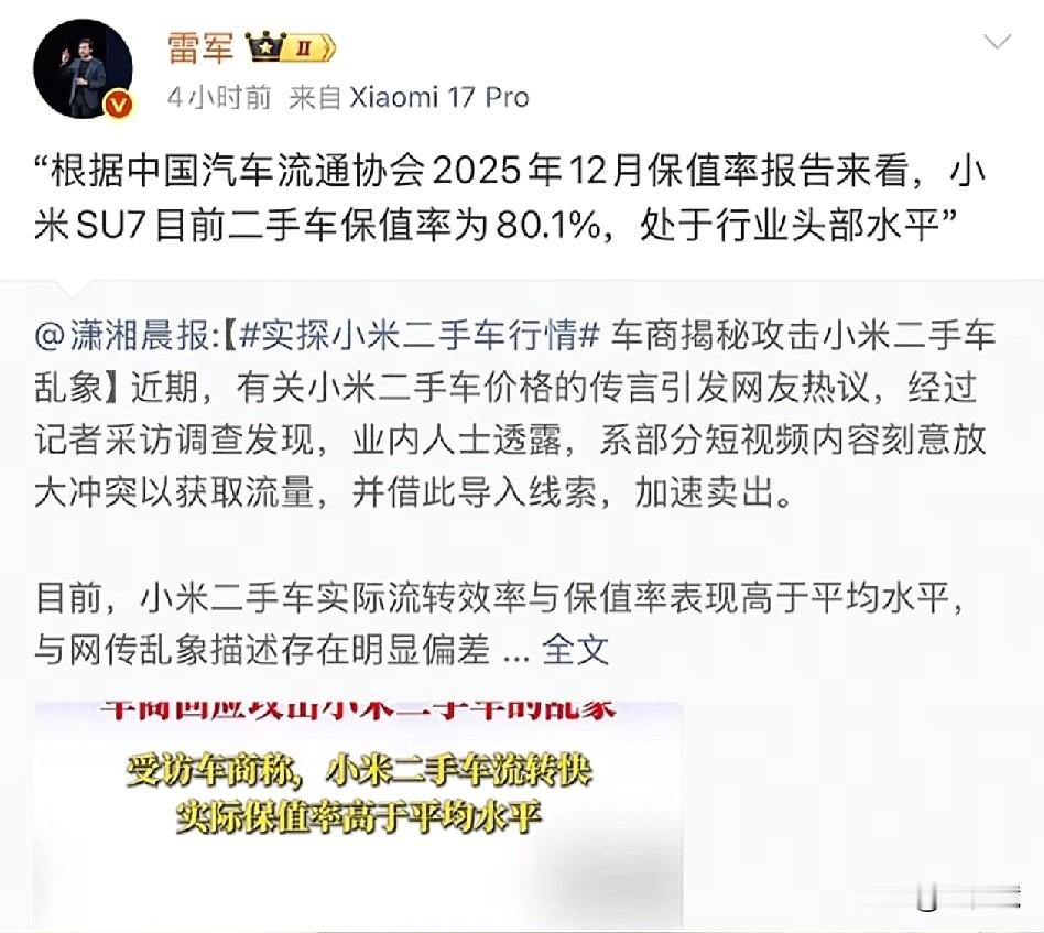 雷军发文称小米su7汽车保值率80.1%,是行业头部的水平。