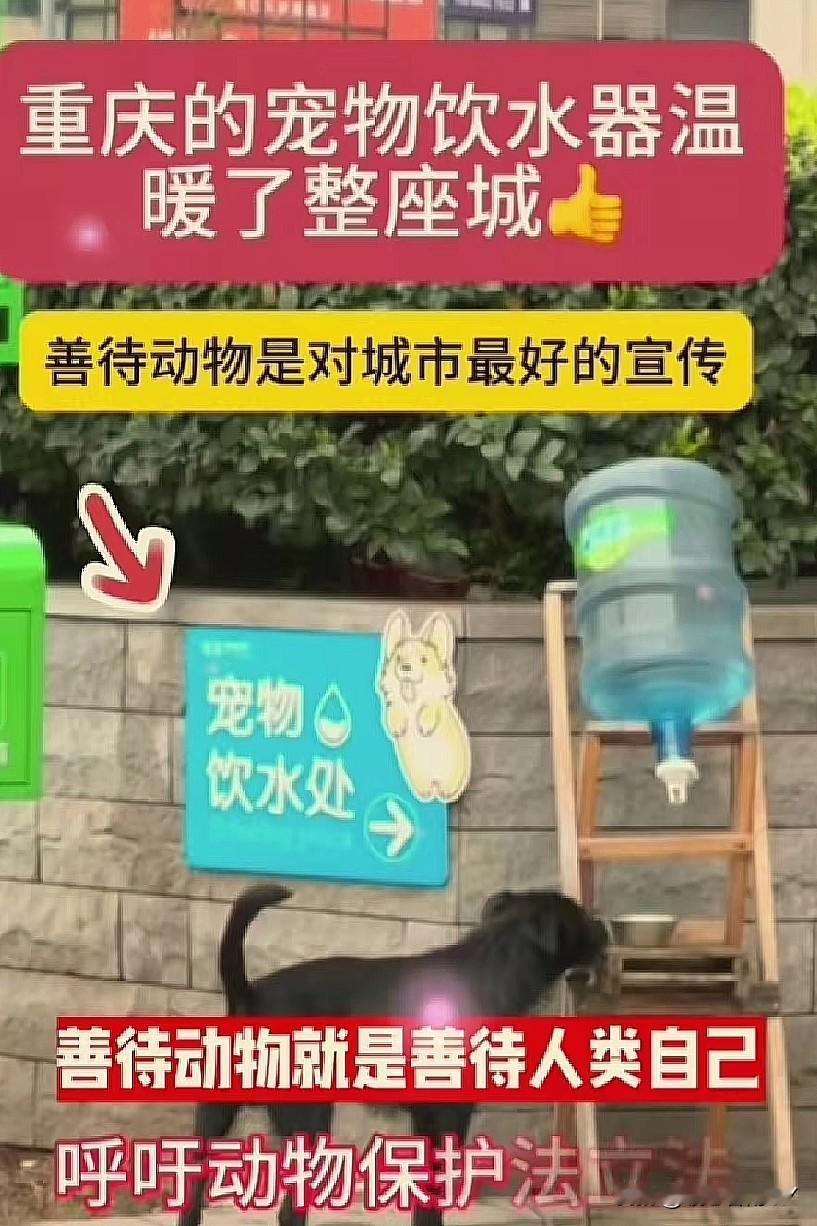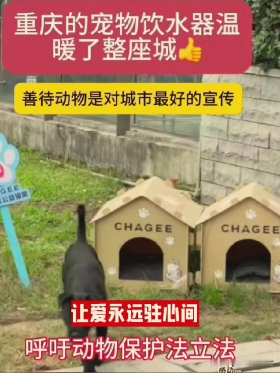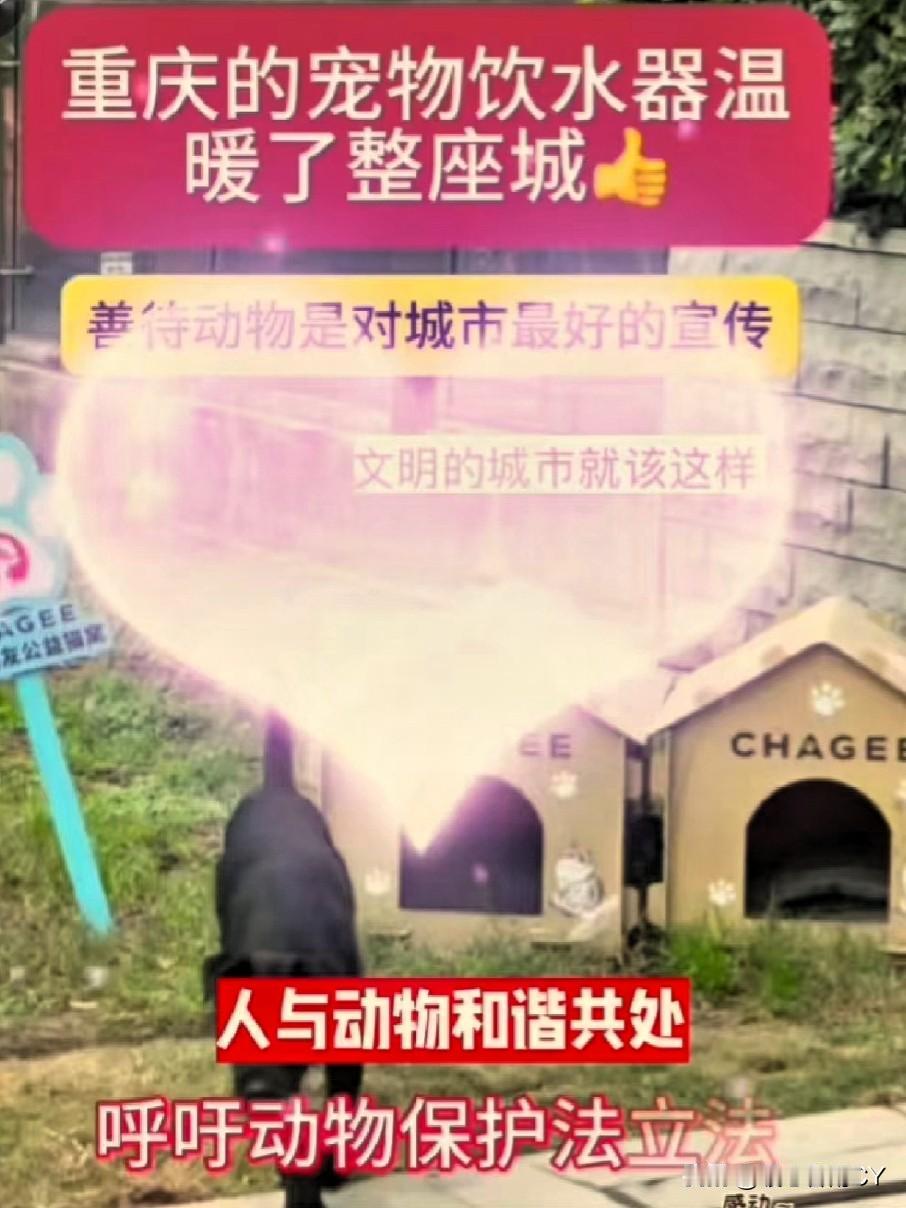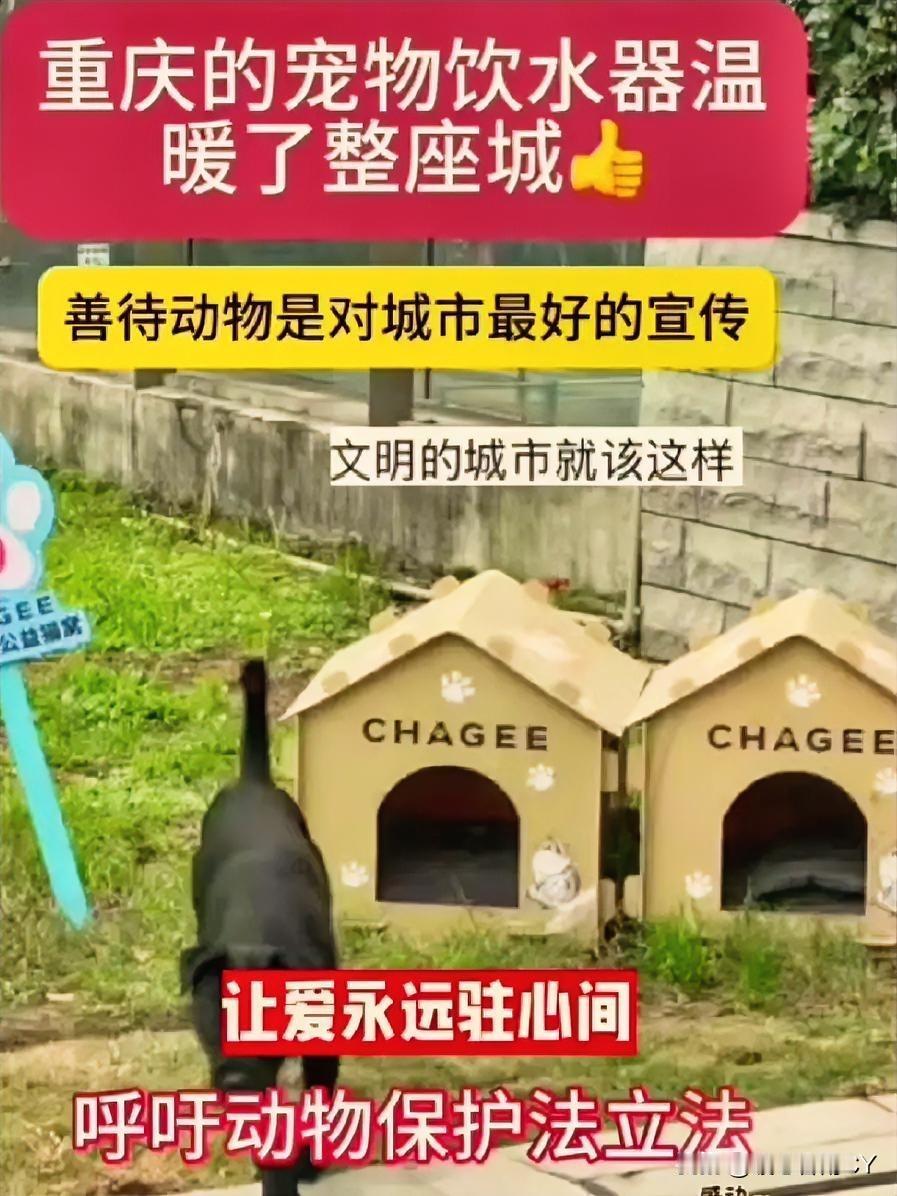 重庆街头这一幕太暖了!街头随处都设有宠物饮水处,24小时盛满清水,遛宠物时,毛孩子再也不用渴着找水喝。 CHAGEE专属宠物屋更是贴心,能为流浪猫遮风挡雨,让它们在寒冬的冬天也有安稳的小窝。 这些看似不起眼的小设施,蕴含着城市最温柔的善意,善待动物并非只是一句口号,它体现在街头的一杯水,一处庇护所,是城市文明的底色。 人与动物和谐共处,才是最动人的风景。愿这份善意被更多人看见,更希望动物保护法能早日出台,让每一份温暖都有法律的保障,让重庆这份温柔传遍更多城市角。