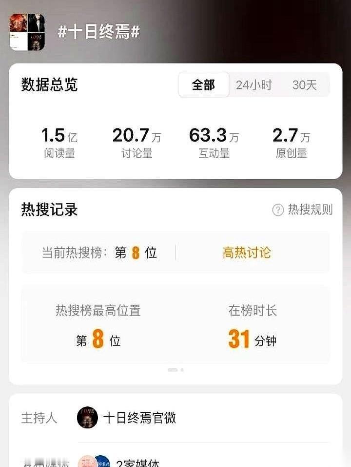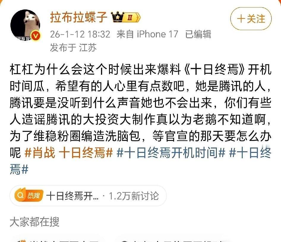 昨晚刚有人在网上漏了个风声,不到一小时,六个高位热搜就跟约好了似的,齐刷刷地砸了下来。 点开一看,全是肖战。 “影视寒冬寒不到肖战”。 “肖战网文排名前五演了四个”。 手指往下一划,又是他的新剧《十日终焉》,连带着开机时间都单独占了一条。 最绝的是什么?那个叫“十日终焉”的词条主持人,不大不小,正好就是剧方官微自己。连马甲都懒得换,亲自下场敲锣打鼓。 这架势,就差把“男主角跑不了”七个大字焊在屏幕上了。 上一次看到这种场面,还是《藏海传》那会儿,一样的配方,一样的味道。 这哪是辟谣,这分明就是顶级资源在付“专属安抚费”,生怕哪句话没说对,自家的财神爷不开心了。