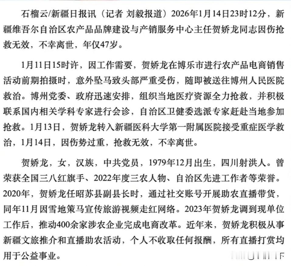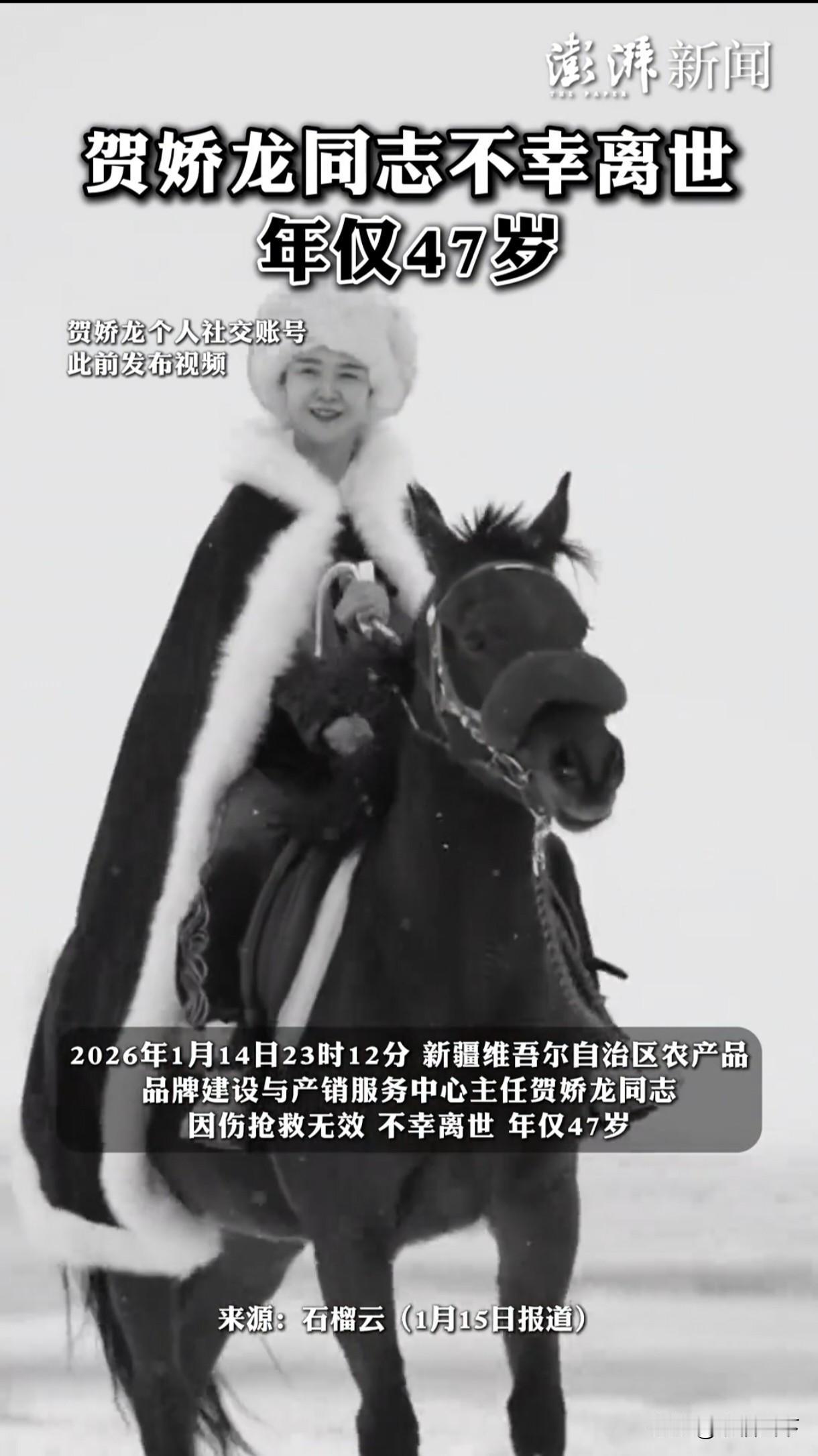 一路走好! 当“贺娇龙同志不幸离世,年仅47岁”的消息刷屏时,无数人对着手机屏幕红了眼眶——那个身披红斗篷、在昭苏雪原策马奔腾的身影,那个说“要把流量留给新疆”的实干者,终究没能等到即将到来的农历马年,永远停在了她热爱的工作岗位上 。 2026年1月14日深夜,官方通报传来噩耗:11日在博乐市拍摄农产品电商宣传视频时,贺娇龙意外坠马致头部重伤,历经三天全力抢救,最终还是没能留住这位47岁的“新疆代言人” 。这个消息像一块巨石砸进网络,628万粉丝的抖音账号下,瞬间被“不敢相信”“一路走好”的留言填满,有人翻出她置顶的策马视频,那句“奋斗不息”的配文此刻读来令人泪目 。 谁能想到,镜头前飒爽无畏的“马背上的局长”,早已把生死置之度外。这不是她第一次坠马,此前拍摄“天马浴河”时摔入冰冷河水,肋骨骨折、胸腔积液也只是笑笑说“值得”,甚至为了呈现最佳效果,在零下二十度的雪原反复拍摄,体重从100斤掉到80多斤 。她曾坦言“失去了快乐,但必须匍匐前进”,可在大众面前,永远是那个充满干劲的模样:4年发628条视频、396场直播,带动农产品销售超3.6亿元,推动400余家涉农企业完成电商改革,把“品味新疆”打造成全国知名品牌 。 更难得的是她的纯粹。爆红后无数商业合作找上门,她却坚持“零报酬、零提成”,所有直播打赏全部用于公益;有人质疑她“想当网红”,她回应“伊犁的山水才是最大的网红” 。她用行动诠释着“公职人员就要为公为民”,从昭苏县副县长到自治区农产品品牌建设主任,岗位在变,为家乡带货、为百姓增收的初心从未改变。那些深夜直播间的沙哑吆喝,那些辗转各地的奔波身影,那些错过的家庭聚会,都是她对这片土地最深情的告白 。 如今,她的最后一条朋友圈还停留在12月26日:“不是所有的坚持都能抵御岁月,但若为热爱,便所向披靡” 。这句感悟成了她一生的写照,也戳中了无数人的心。我们总说“岁月静好”,却忘了总有人在负重前行;我们羡慕“流量光环”,却忽略了背后是日复一日的坚守与付出。贺娇龙的离去,让我们看清了什么是真正的“网红”——不是昙花一现的热度,而是扎根大地的实干;不是精致利己的算计,而是公而忘私的奉献。 此刻,新疆的草原还在等待她的身影,老乡们的农产品还盼着她的吆喝,而那个身披红斗篷的女侠,却永远留在了寒冬里。但她播下的种子已经发芽,她点燃的热爱正在传递。你是否也曾被她的视频打动过?是否买过她推荐的新疆好物?欢迎在评论区留下你的回忆,让我们一起送别这位真正的人民公仆,致敬这份“为热爱所向披靡”的赤诚。