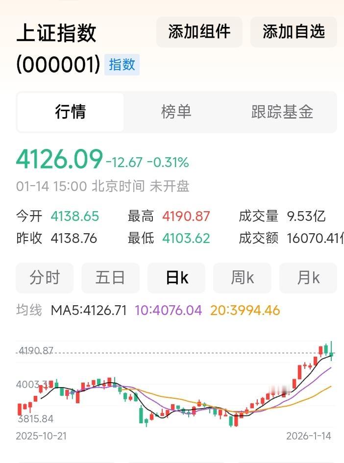 有人说,牛市倒计时。 上证才4100多点,这哪到哪呀?还用旧时思维。 4000点才是牛市的起点,哪有就这样结束的! 离5000点还远着呢。 当然,这一段时间大盘连涨,稍作调整也是正常的,说牛市结束,那是荒唐,扰乱人心。 现在的状况下,相信股市应该有一波大的行情。 到了5000点再说。