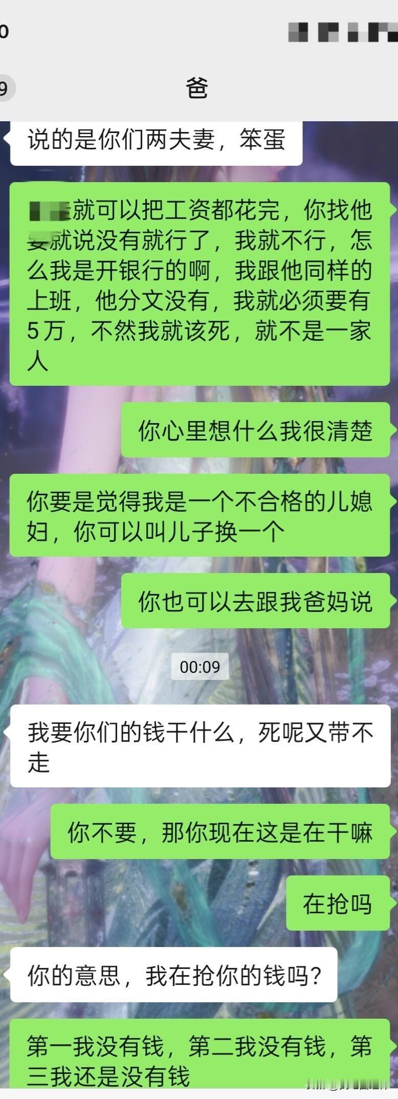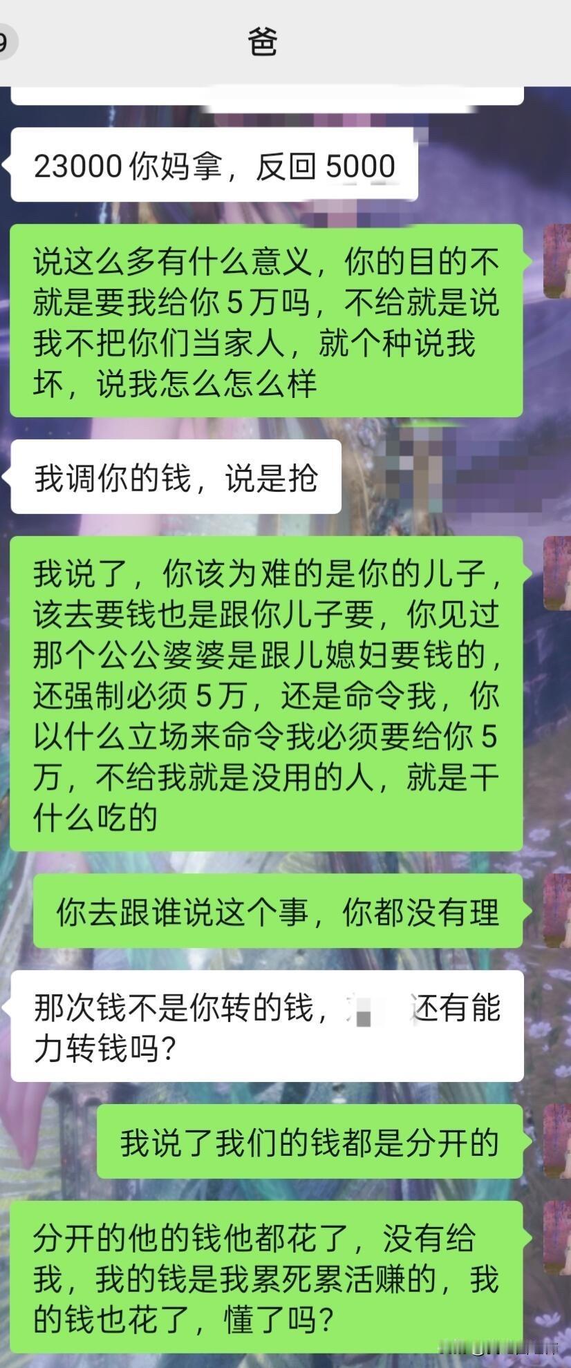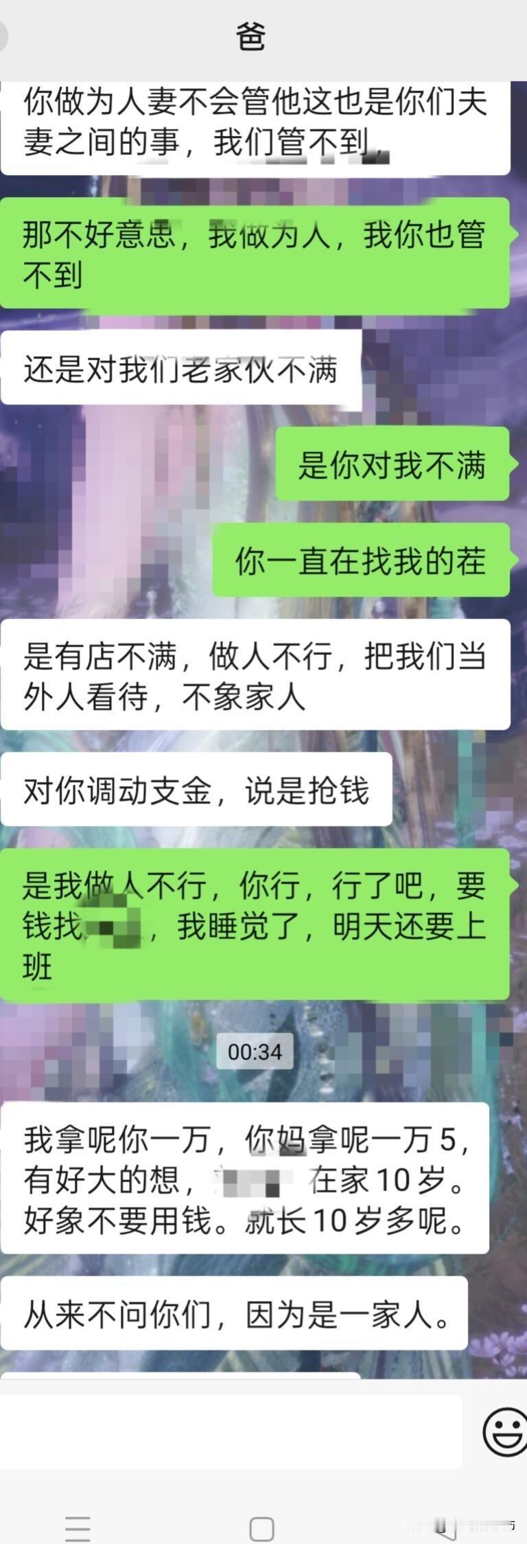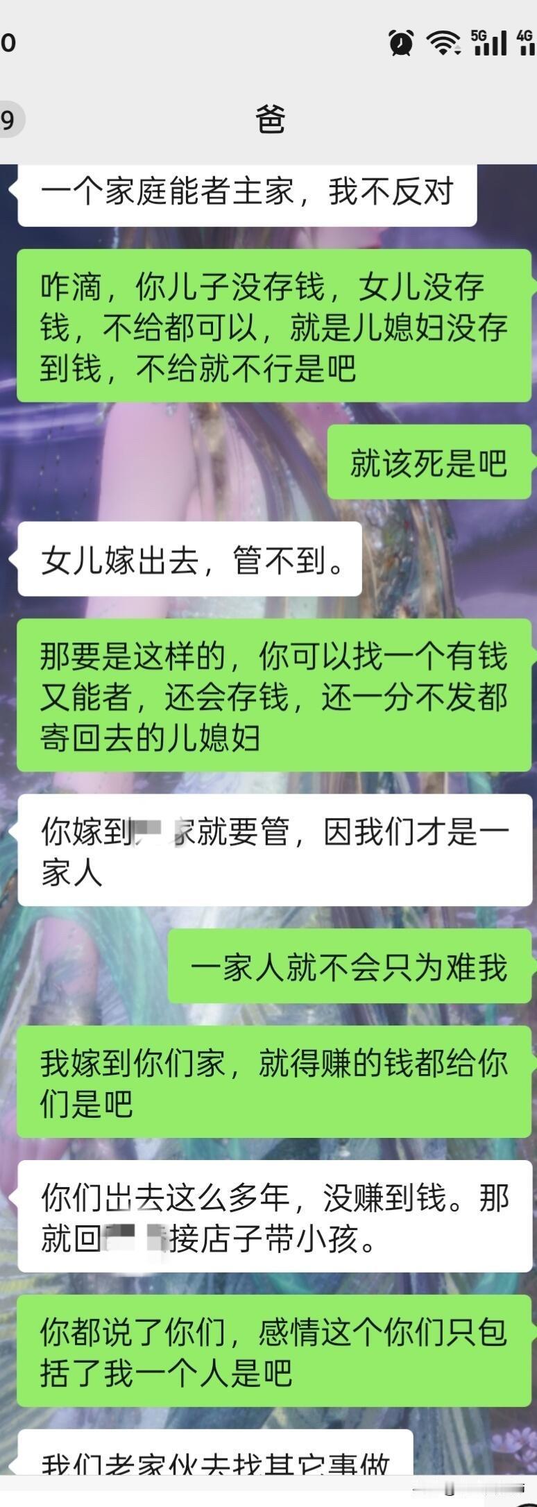 这婚该离吗? 事情是这样的,今天我下了班就回房间了,没多久就听见我公公打电话给我老公,问他这么多年了存了多少💰,我老公说没存到💰,我公公把他说了一顿,说他没用啥的,然后又问他我存了多少了,说这么多年了最少也有20w了,他说我也没多少就3w左右可能,他爸就在电话里说他要💰生💰什么的,他爸在老家开了个小店意思要我把💰拿回去给他进货,但是家里的生意很差,他们做了几十年生意还亏了10来w,后面就是个种给我老公洗脑要他来跟我要💰,我老公说我不会听他的,跟我说不通的,让我公公自己跟我说,然后就有了这些聊天记录,我越聊越觉得气,越想离婚,躺在床上翻来覆去睡不着,他倒是睡得跟个屎🐷一样。