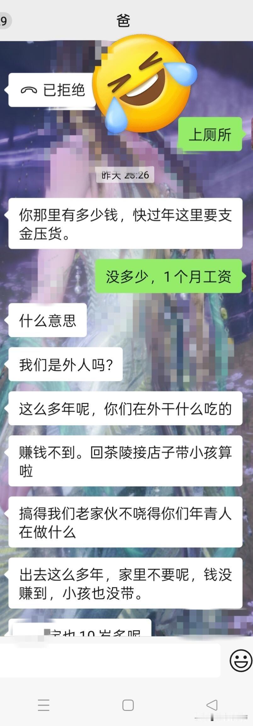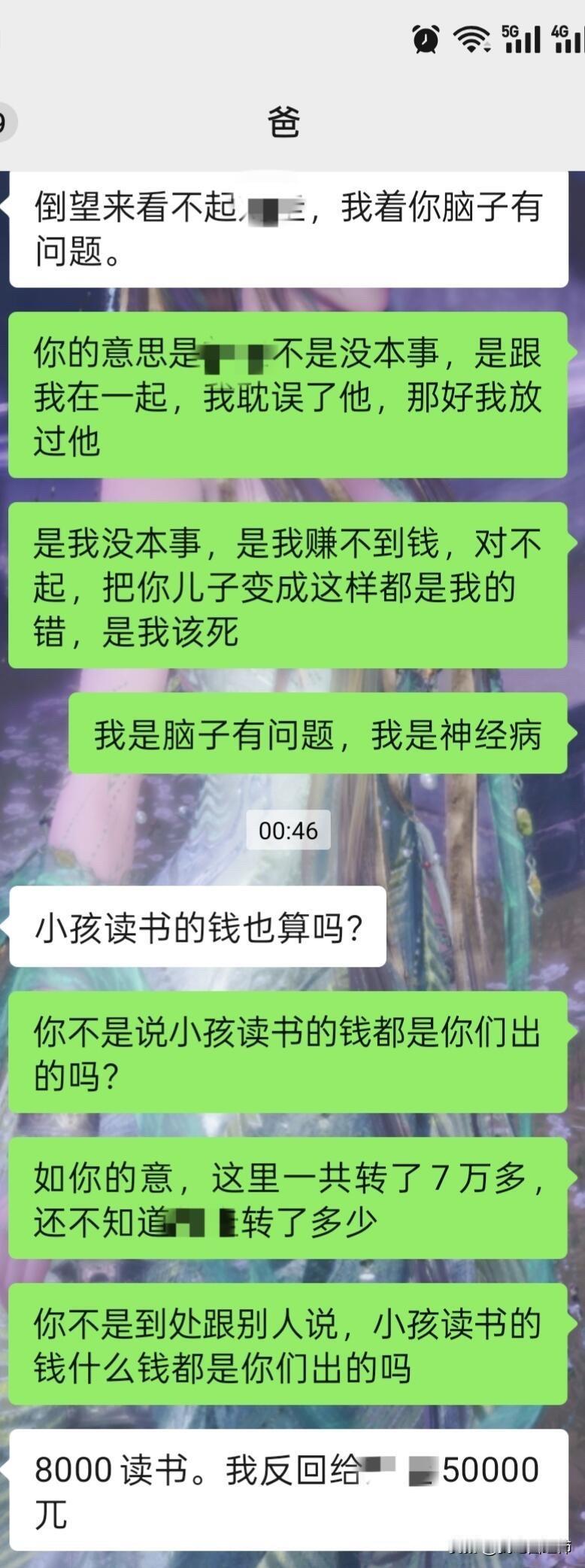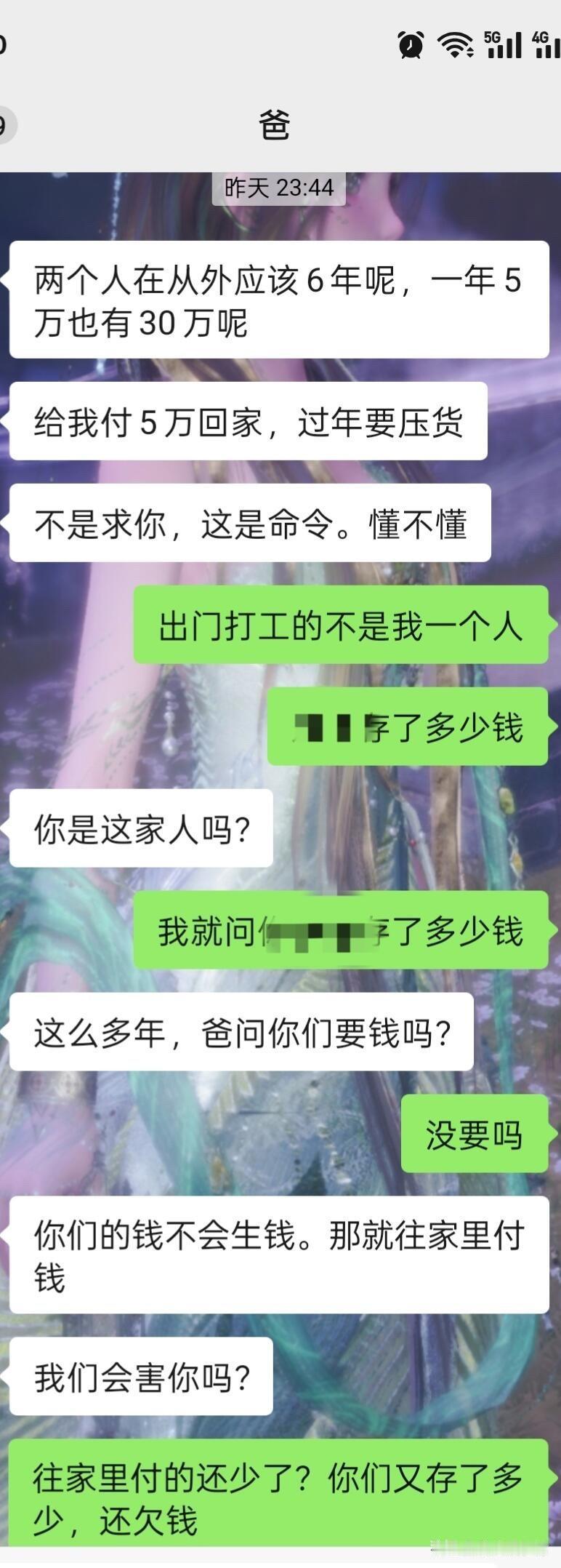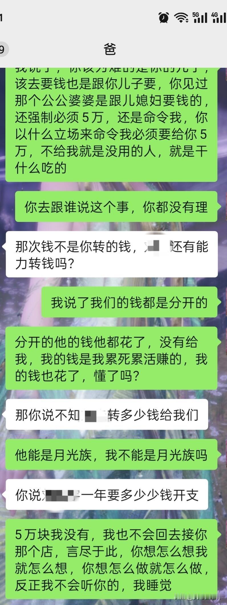 这婚该离吗? 事情是这样的,今天我下了班就回房间了,没多久就听见我公公打电话给我老公,问他这么多年了存了多少💰,我老公说没存到💰,我公公把他说了一顿,说他没用啥的,然后又问他我存了多少了,说这么多年了最少也有20w了,他说我也没多少就3w左右可能,他爸就在电话里说他要💰生💰什么的,他爸在老家开了个小店意思要我把💰拿回去给他进货,但是家里的生意很差,他们做了几十年生意还亏了10来w,后面就是个种给我老公洗脑要他来跟我要💰,我老公说我不会听他的,跟我说不通的,让我公公自己跟我说,然后就有了这些聊天记录,我越聊越觉得气,越想离婚,躺在床上翻来覆去睡不着,他倒是睡得跟个屎🐷一样。