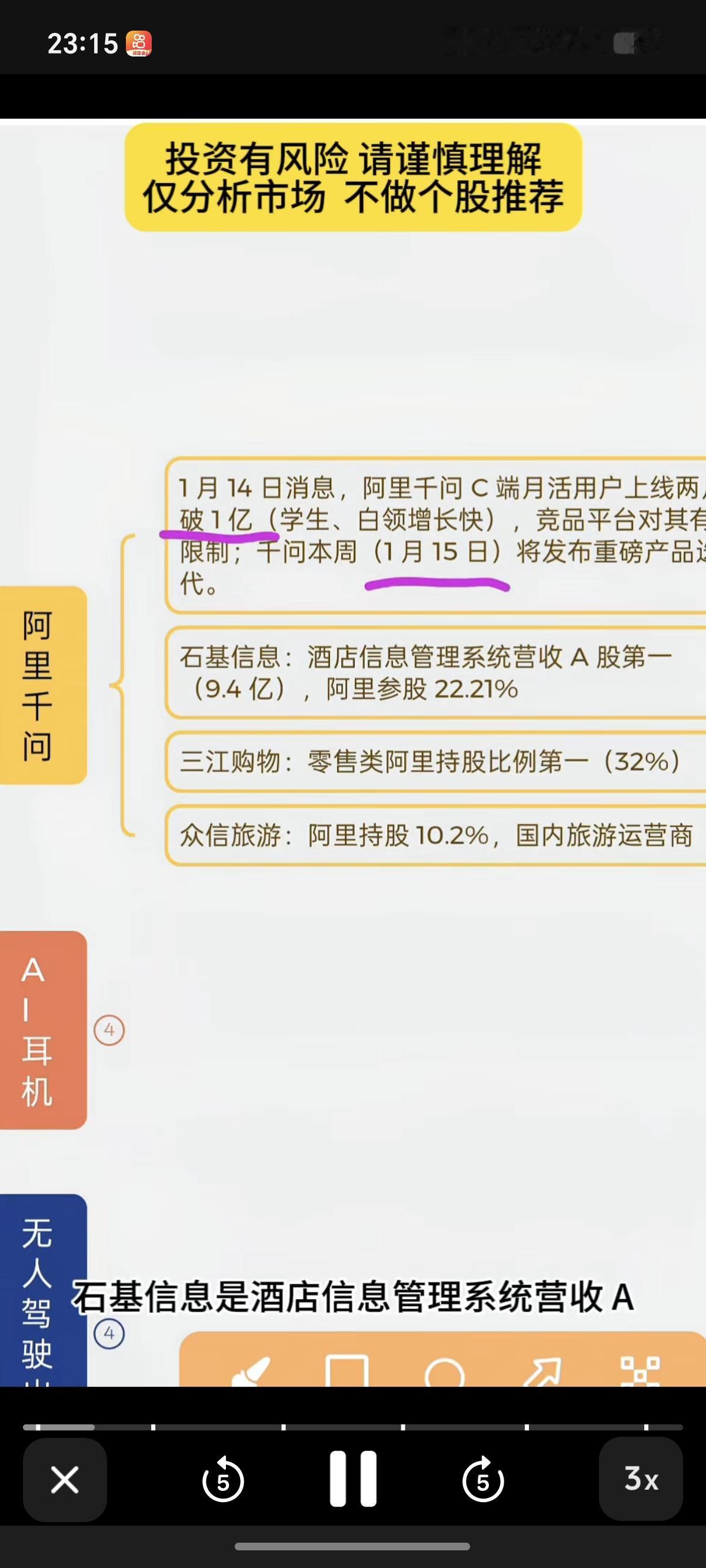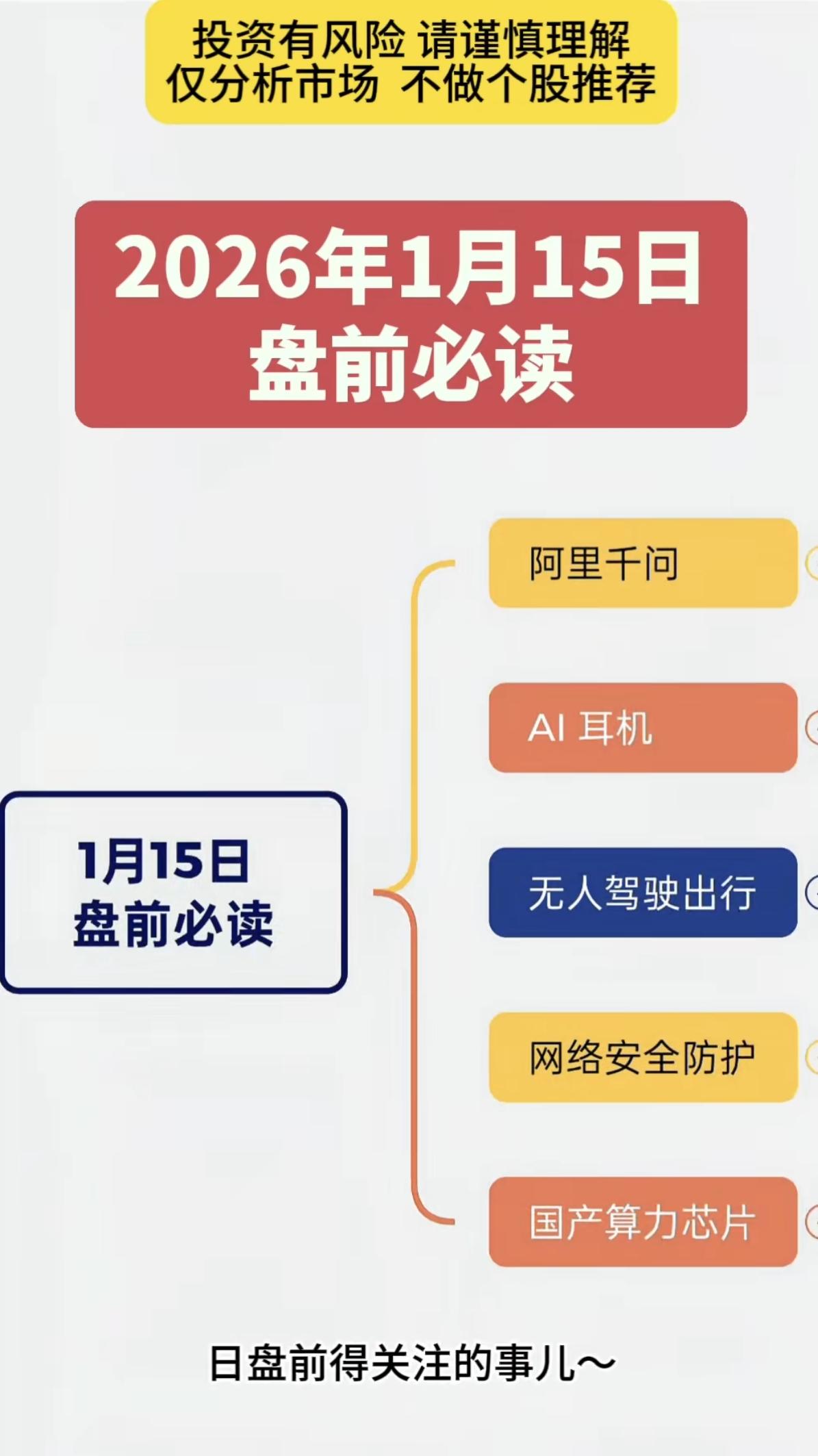 1.15周四 盘前 财经热点必读! 1.阿里千问 2.智能AI耳机 3.无人驾驶出行 4.网络安全防护 5.国产算力芯片