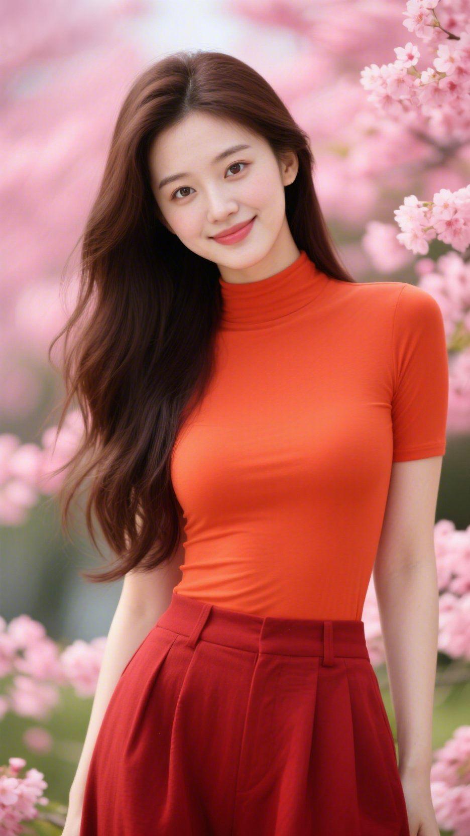 《橙衫裹满樱间暖光》 樱风裹着粉香漫过肩头时,她立在花影里,橙衫似揉进春日暖阳的柔意。 衣身舒展妥帖,暖调里裹着松弛的气息,红裙轻垂的弧度浸着春的软和,恰好与身侧樱瓣衬成一帧温柔。身后花雾漫向天际,粉柔的瓣朵把风都染得甜软。 她抬眼笑时,发梢沾着樱的碎影,将春的轻寒滤作温软的光。风掠过花枝,落瓣擦过袖角,空气里浸着浅淡的香——原来春的鲜活不必张扬,一件合宜的衣、一片拥樱的林,就能让季节的光,都落得清柔自在。 站在这样的樱间里,节奏都慢了下来:风是轻的,花是软的,衣是妥帖的,连呼吸里都裹着春的闲静。这大抵是春日最好的模样,不用奔赴远途,一处樱林、一身暖衣,便把生活的甜,揉进了此刻的时光里。 樱间春意 橙衫暖韵