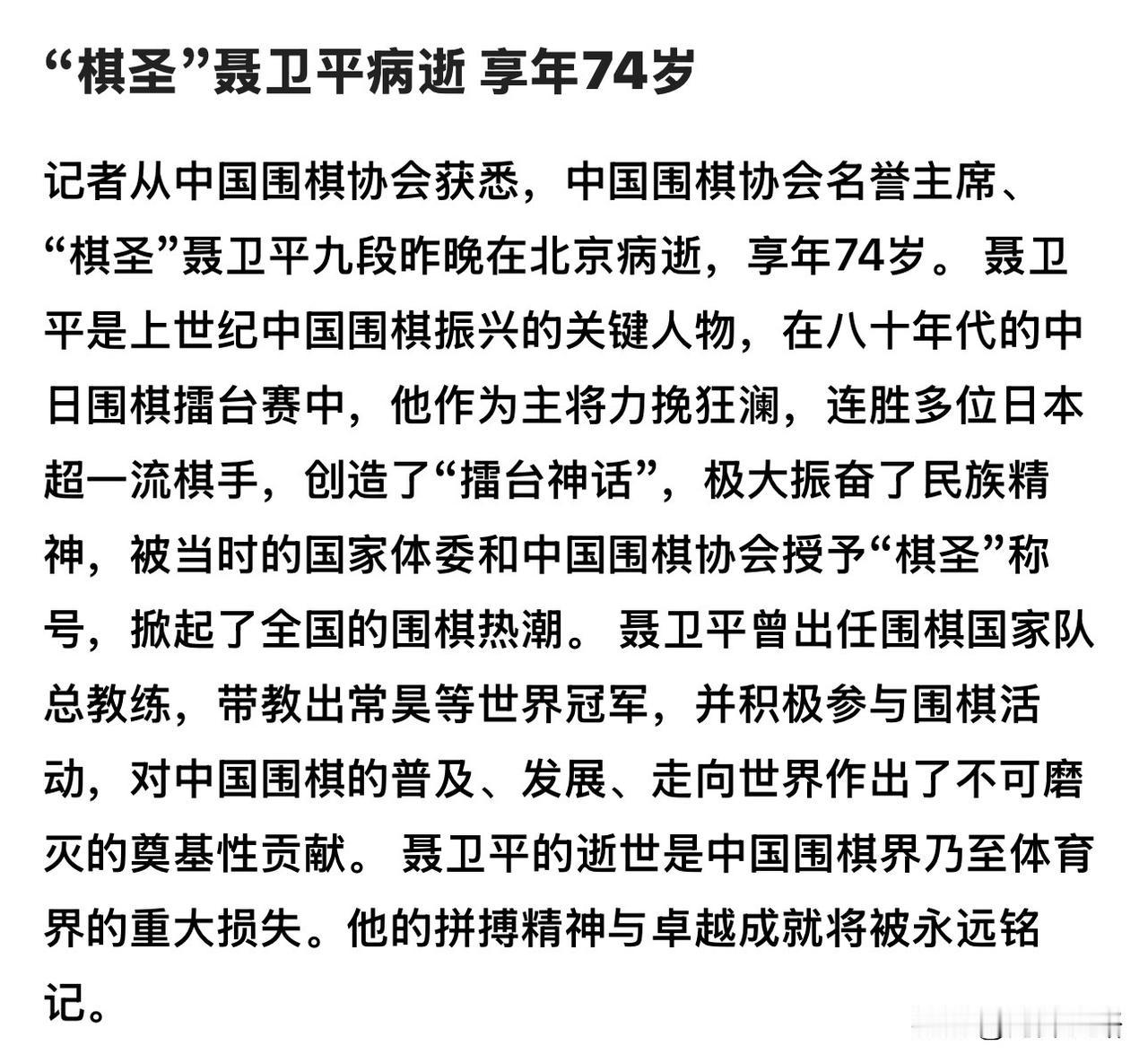 在日本围棋巅峰时刻,聂卫平横扫日本几乎所有“超一流”,开创黄金时代。又因私生活糜烂,1989年在新加坡输掉应氏杯,当时名不见经传的韩国棋手曹薰铉拿下冠军,又培养出李昌镐。大陆围棋进入10多年的“苦难行军”。如果当初聂卫平在形势大优的情况下保持充沛体能,一切或将不同。 总之,从聂老到老聂,现在终于又回到聂老。斯人已逝,围棋也进入AI时代,但永远怀念聂卫平,在最需要奇迹的时候,他给全国人民带来喜悦与信心。