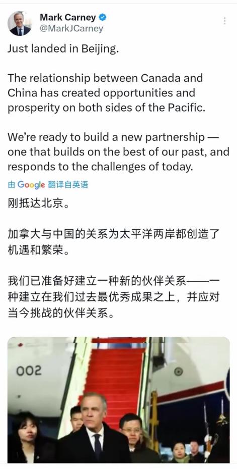 加拿大总理马克·卡尼1月15日发文说:“刚抵达北京。加拿大与中国的关系为太平洋两岸都创造了机遇和繁荣。我们已准备好建立一种新的伙伴关系——一种建立在我们过去最优秀成果之上,并应对当今挑战的伙伴关系。” 加拿大这几年的经济日子过得特别憋屈,全程被美国攥在手里拿捏。从2025年开始,加拿大经济就没了往日劲头,央行一次次降息降到2.25%,也没能挽回下滑的势头。 第二季度经济直接萎缩1.6%,全年GDP增速被下调到1.1%,2026年的预期也才1.2%,比之前的预估少了将近一个百分点。支撑经济的核心产业全被打垮了,美国的关税大棒精准砸向汽车、钢铝、木材这些加拿大的支柱行业。 关税税率从几乎可以忽略的0.1%一下子涨到5.9%,出口连续两个季度比去年同期下滑,企业也不敢轻易投资,意愿跌到了历史低位。就连加拿大央行都承认,和美国的贸易冲突已经造成了结构性损害,拉低了整个国家的生产能力。 雪上加霜的是,今年7月美墨加协定要进行首次续签审议,美国趁机狮子大开口,给加拿大列了一堆苛刻条件,几乎没办法完全满足。美国既要求加拿大扩大美国乳制品的市场准入,又逼着加拿大修改针对美国流媒体和科技公司的法案。 还得解除对美国威士忌的销售限制,甚至把手伸到了加拿大省份的电力供销领域。这些根本不是什么贸易协商,就是强买强卖的霸权做法。加拿大要么牺牲本国产业利益妥协,要么就面临协定失效、贸易关系进一步恶化的局面。 特朗普政府还放话,要考虑终止三边协定,转而搞双边谈判。目的很明确,就是想把加拿大绑得更紧,让它彻底变成美国商品的倾销地和经济附庸。 被美国这样卡着脖子,加拿大能走的出路没几条,中国自然成了最靠谱的选择。中国长期以来都是加拿大的第二大贸易伙伴,双方没有历史纠葛,经济上还能互补,这是加拿大摆脱对美依赖的最佳突破口。 卡尼心里跟明镜似的,靠美国只会越陷越深,只有抱住中国市场的大腿,才能在经济泥潭里喘口气。这也是他带着几乎全套内阁核心成员访华的原因,外交、工业、能源、农业、贸易部长全都来了。摆明了就是要全方位对接中国,争取实实在在的合作好处。 从短期来看,卡尼这趟来就是为了救急,把攒了好久的贸易诉求落地变现。加拿大的油菜籽、能源、农产品这些产业,早就盼着能打开中国市场了。去年布洛伊斯就带着经贸代表团先来探过路,核心就是谈油菜籽重新进入中国市场的事。 2025年前11个月,加拿大对华出口原油将近1亿桶,液化天然气超过20万吨,中国已经是加拿大能源项目的最大买家之一。还有125家加拿大企业参加进博会,创下了历史新高。 这些数据都能证明,中国市场能给加拿大经济注入强心剂。卡尼这趟就是要趁热打铁,巩固双方在能源、农业上的合作,让更多加拿大商品进入中国。这样才能缓解出口疲软和企业经营的压力,这也是最直接的短期救急办法。 从长期来看,这更是加拿大的战略自救,核心就是降低对美国的经济依赖,让贸易渠道更多元。卡尼政府早就明确说了,要在未来10年把对非美市场的出口翻一番,中国正是这个战略的核心支点。 加拿大已经意识到,过度依赖美国的经济结构就是颗定时炸弹。美国说翻脸就翻脸,说加关税就加关税,说提条件就提条件,加拿大根本没有讨价还价的余地。 所以卡尼才说要和中国建立“新伙伴关系”,本质上就是想借着中国的市场和合作,培育新的经济增长点。在能源、绿色经济、金融、养老这些领域拓展合作空间,慢慢摆脱被美国牵着鼻子走的被动局面,重新搭建加拿大的经济安全边界。 这趟访华对卡尼政府来说,就是背水一战。他公布的“历史性”预算赤字已经扩大到783亿加元,未来五年还要投资2800亿加元提振经济。这些计划能不能落地见效,很大程度上要看外部市场给不给力。 中国作为全球第二大经济体,又是加拿大重要的贸易伙伴,既能承接加拿大的能源和农产品出口,又能在基础设施、绿色经济这些领域提供合作机遇。 这些都是加拿大眼下最急需的。卡尼那句“建立在过去最优秀成果之上”,说白了就是想借着之前中加合作的基础,争取更多实际利益。而“应对当今挑战”里的核心挑战,就是美国的贸易霸凌和本国的经济困局。 说到底,卡尼在北京说的那些漂亮话,都是给合作裹的一层糖衣,骨子里全是加拿大的现实算计。美国把加拿大当成可以随意拿捏的附庸,加拿大没办法,只能转头向中国寻求支撑。这既是被逼出来的选择,也是清醒的战略判断。 短期靠中国救经济、解贸易困境,长期靠中国对冲美国风险、实现经济自主,这就是卡尼此行的全部心思。 中加合作确实有很大空间,但加拿大能不能真正摆脱对美依赖,实现战略自救,最终还要看它能不能拿出足够的诚意。放下顾虑推进务实合作才是正道,毕竟天上不会掉馅饼,中国市场的机遇从来都是留给有准备的伙伴。
