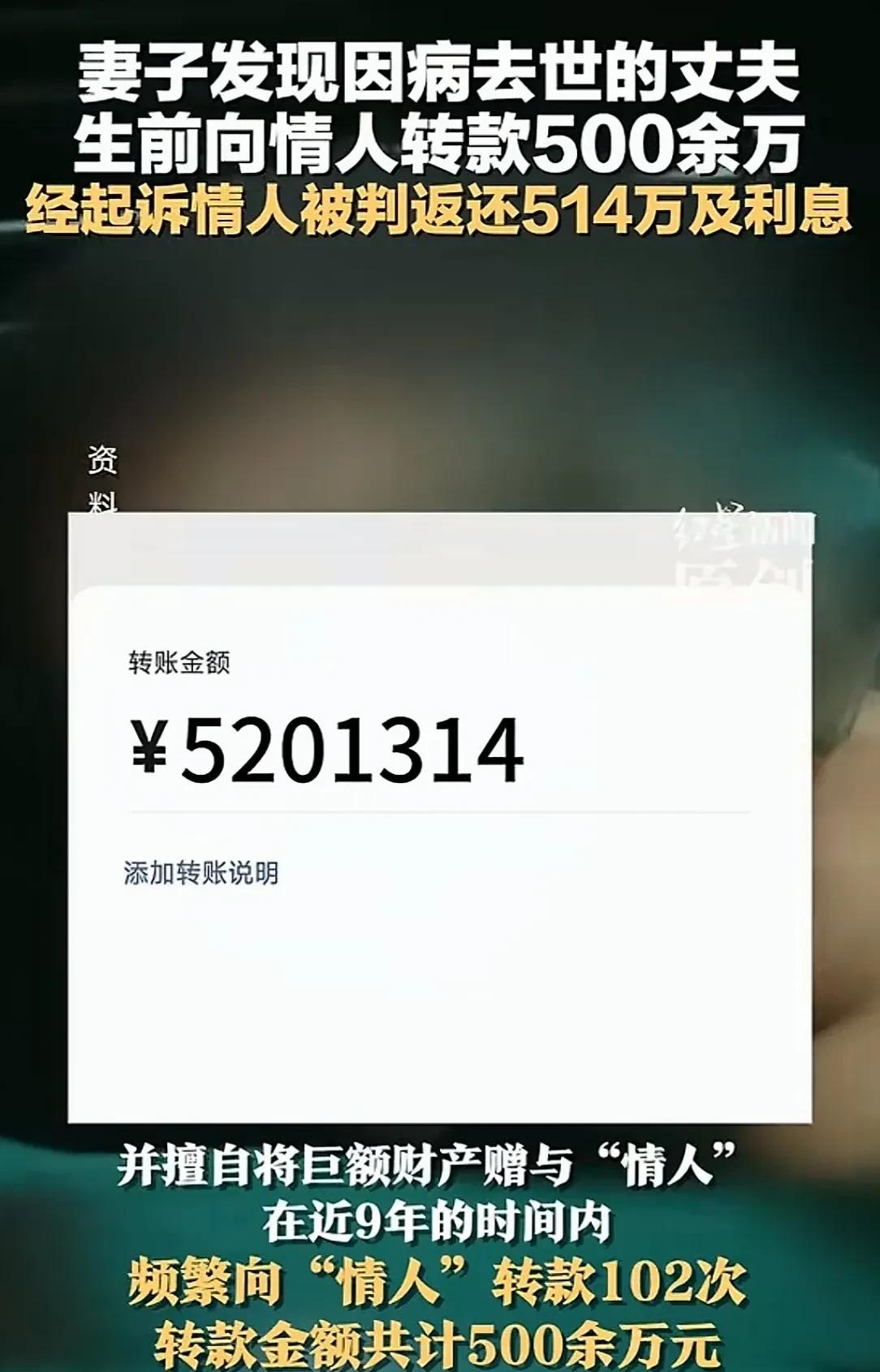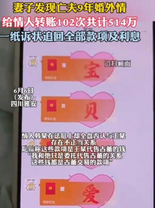 四川雅安,一女子在丈夫病逝4个月后,发现他的“惊人秘密”,他竟在9年前就背叛了自己,给情人转账102次,共计555.49万元,她和丈夫夫妻40多年,他却背着自己,把他们辛苦挣得钱便宜了第三者,女子愤怒的把第三者告上法庭,要求全数返还,而第三者的解释让女子怒火中烧,法院判决也意想不到。 一纸判决落下,514万元及利息的返还金额,为一场跨越九年的婚内财产纠纷画上句点。 但对四川雅安的李某而言,这场胜诉没能抚平半分伤痛,四十余年相濡以沫的婚姻,终究败在了丈夫藏得严严实实的背叛里。 时间倒回2024年6月,距离丈夫王某病逝已过去四个月。 此前,李某守在病床前的日日夜夜还历历在目,端水喂药、打理琐事,她以为这是半生夫妻情分里,最后一段相守的时光。 直到因另案需要,她向法院申请调取丈夫的银行流水,才掀开了这个家庭最不堪的一角。 流水单上,一个备注为“小韩”的收款人反复出现,转账记录从2014年10月延伸到2023年2月,足足102笔,累计金额高达555.49万元。 这个数字,让勤俭了一辈子的李某手脚冰凉。 她想起家里用了二十年没舍得换的冰箱,想起自己从没买过超过两百元的衣服,想起为了孙子满月酒四处借钱的窘迫,更想起那些被丈夫挪去给女儿买房的积蓄。 这些凝结着两人汗水的钱,竟被悄无声息地输送给了另一个女人。 顺着流水的线索,李某打开了丈夫生前常用的手机。 暧昧的聊天记录跳出来,“想你了”“节日快乐”的字眼刺得她眼睛生疼,三亚豪华酒店背景的亲密合影,更是让她瞬间瘫坐在地。 更让人心寒的是,部分转账就发生在丈夫父亲生病、家里欠债的艰难时刻,他一边让李某扛起家庭重担,一边却将夫妻共同财产拱手送给情人。 悲愤交加的李某,第一时间找到收款人韩某,她抱着一丝希望,想让对方主动返还这笔钱,可韩某的态度强硬又冷漠,一口咬定转账是正常的古董代售佣金,两人只是生意伙伴。 协商无果后,李某只能拿起法律武器,将韩某告上四川省雅安市雨城区人民法院。 庭审现场的对峙,远比想象中更尖锐,韩某身着光鲜的名牌套装,坚称转账与婚外情无关,却拿不出任何古董交易的合同、单据或委托手续。 法官的追问直击要害:九年时间102笔转账,金额从500元到150万元不等,既无交易备注,又不符合古董买卖“一次性结清”的行业惯例,这样的“佣金”,实在站不住脚。 反观李某提交的证据链,完整得让人无从辩驳。 银行流水、微信聊天记录、亲密合影,再加上部分转账备注里的“爱你”字样,以及情人节、七夕等特殊节点的转账时间,都指向一个事实:这些钱,是王某为维系不正当男女关系的赠与。 法院的判决,最终给出了明确答案。根据《中华人民共和国民法典》相关规定,夫妻对共同财产享有平等处理权,非因日常生活需要处分大额财产,必须经双方协商一致。 王某未经李某同意,擅自将夫妻共同财产赠与第三者,既侵犯了配偶的合法权益,又违背公序良俗,赠与行为自始无效。 最终,法院判令韩某返还李某514万元及相应利息,双方均服判息诉。 拿到判决书的那天,阳光格外刺眼,李某却觉得浑身发冷,钱追回来了,可那些被辜负的岁月,那些付出的真心,再也找不回来了。 她摩挲着手上戴了几十年的银戒指,那是当年两人结婚时,用第一笔摆摊赚的钱买的,如今戒指依旧,人心却早已面目全非。 网络上,不少网友为李某的遭遇唏嘘不已,有人说,最狠的背叛,是枕边人藏了半辈子的谎言;也有人说,法律能惩恶扬善,却补不回破碎的心。 而这起发生在雅安的纠纷,更像是一面镜子,照见了婚姻里最不该触碰的底线。 终究,忠诚是底线,信任一旦破碎,岁月难以弥合伤痕,那些妄图在婚姻里藏污纳垢的人,终究会在法律与道德的审判面前,露出最真实的模样。 信息来源:红星新闻2025-06-08发布:妻子发现病逝丈夫生前向情人转款数百万,法院判决情人返还514万元及利息