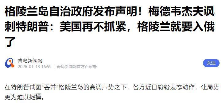 梅德韦杰夫太可怕了,他帮特朗普出了个“损招”,把欧洲吓得够呛。   1月12日,梅德韦杰夫在社交平台发文,直接喊话特朗普:“你要抓紧时间了。根据未经证实的消息,几天后格陵兰岛的5.5万居民可能要进行公投,若他们同意加入俄罗斯,那美国就前功尽弃了。”   明眼人都能看出,这是一句十足的调侃。格陵兰岛作为丹麦的自治领地,虽有5.7万左右居民,且85%为原住民因纽特人,有着强烈的民族认同感,此前已明确表态“不想成为美国人”,更不可能突然谋求加入俄罗斯。   梅德韦杰夫自己也特意标注“未经证实”,把“玩笑”的属性摆得明明白白。但就是这句玩笑话,却在欧洲引发了轩然大波,各国反应之激烈,远超事件本身的戏谑性质。   欧盟外交与安全政策高级代表卡拉斯紧急与德国防长发表联合声明,强调格陵兰岛“正在受到保护”;丹麦首相更是直言,面对来自盟友的“完全不可接受的压力”,丹麦正遭遇前所未有的艰难局面;还有欧洲官员直接警告,美国若执意夺取格陵兰岛,将导致北约走向终结。   看似轻描淡写的一句调侃,为何能让欧洲如此紧张?核心就在于梅德韦杰夫精准拿捏了欧美之间的矛盾痛点,这招看似简单,实则一举多得,堪称外交博弈中的妙手。最关键的一点,就是成功离间了本就裂痕渐生的欧美关系。   这些年,美国为了自身利益,屡屡无视欧洲盟友的感受,此次对格陵兰岛的觊觎,更是直接触碰了欧洲的安全红线和主权底线。   而梅德韦杰夫的话,相当于在欧美之间的裂缝上又狠狠踩了一脚,让欧洲不得不重新审视与美国的盟友关系——连盟友的领土都想觊觎,这样的同盟还能靠得住吗?   卡拉斯那句“美国仍是盟友但关系不如以前那么好了”,正是这种不信任感的直接体现。   除此之外,这一表态还巧妙地敲打了特朗普政府的霸权野心。特朗普政府近期动作频频,先是突袭委内瑞拉,如今又将矛头指向格陵兰岛,一副恃强凌弱的姿态。   梅德韦杰夫用“公投入俄”的假设进行调侃,实则是在提醒美国,国际社会不是美国的后花园,肆意妄为终将付出代价,若不收敛,可能会出现意想不到的变数,让美国的图谋竹篮打水一场空。   同时,这也间接呼应了格陵兰岛民众的意愿,格陵兰岛各政党领导人早已发表联合声明,强调“格陵兰的未来应由自己决定”,85%的民众反对成为美国的一部分,梅德韦杰夫的言论,无疑让格陵兰岛的反对声音得到了更多国际关注,也让美国的图谋更加不得人心。   不得不说,梅德韦杰夫这招确实高明。不用剑拔弩张的强硬表态,仅凭一句玩笑话,就搅动了国际局势,既达到了离间欧美关系的目的,又敲打了美国的霸权行径,还顺势争取了舆论主动,可谓一箭三雕。   如今,欧洲的焦虑已然摆在明面上,美国与欧洲的盟友关系进一步承压。后续欧美关系如何发展,格陵兰岛风波能否平息,值得持续关注。