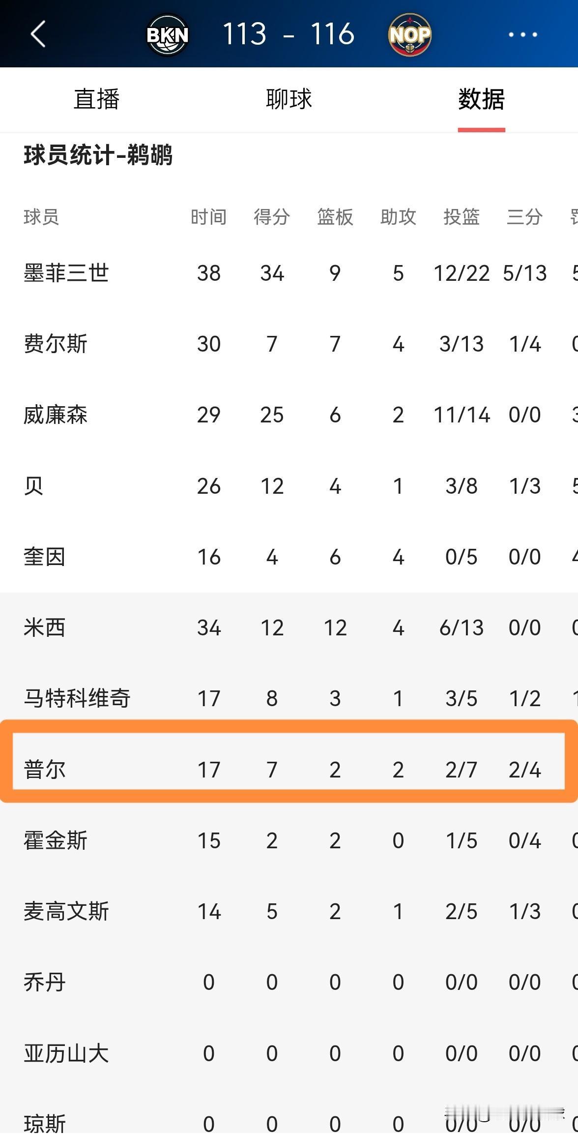 鹈鹕球星乔丹-普尔真是神一场鬼一场!在今天鹈鹕主场以116:113力克篮网的比赛中,普尔没有能够延续上一场比赛的出色状态表现的相当低迷,他在替补出战的17分钟里,投篮7中2,其中三分球4中2、罚球2中1得到7分,他的场上正负值为-2。 坦白说,如今普尔在鹈鹕的境遇真是让人唏嘘不已,要知道当普尔效力勇士时他被誉为“库里接班人”;当普尔效力奇才时,普尔更是拥有无限开火权的当家球星,可是如今的普尔却彻底的沦为了一名角色球员。