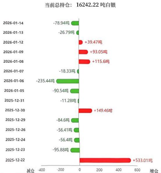 随着周三贵金属大幅飙升, 现货白银更是首次突破90美元关口, 最高升至93.5美元附近, 收盘于93美元上方。 那么白银ETF是否也会大幅增仓? 通过全球最大白银ETF--iShares Silver Trust 持仓的数据显示,1月14日持仓较上日减少78.94吨, 当前持仓量为16242.22吨。 这也是连续第二日减少持仓, 是否说明白银面临一定压力? 今日上午的回调是否能得到初步验证?