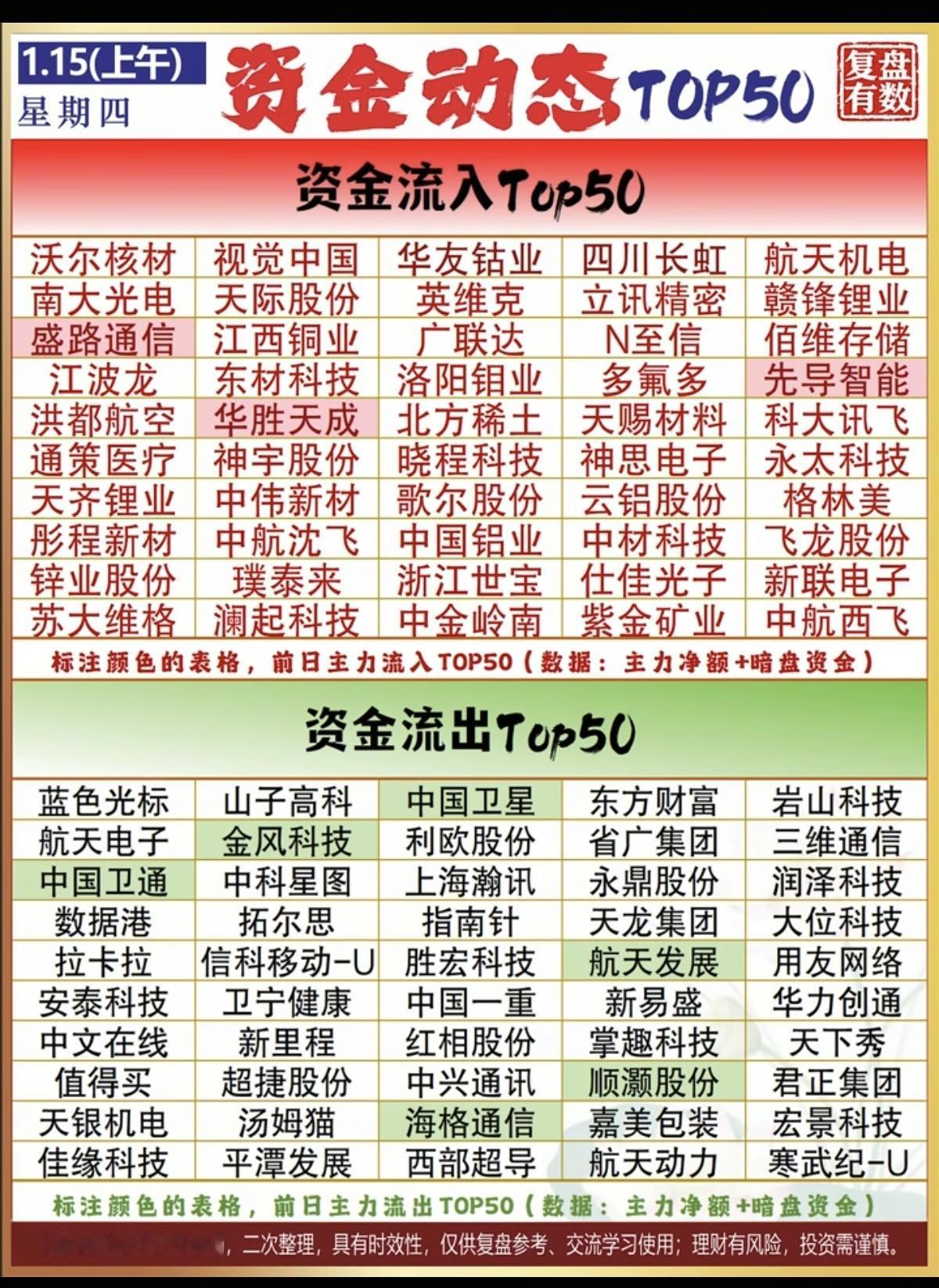 1.15周四 主力大资金 抢筹出逃个股榜! 资金流入: 能源金属碳酸锂,稀缺资源,氟化工,电池相关,贵金属等资金流入明显 资金流出: 软件开发,AI应用,通信服务,网络游戏等板块资金流出