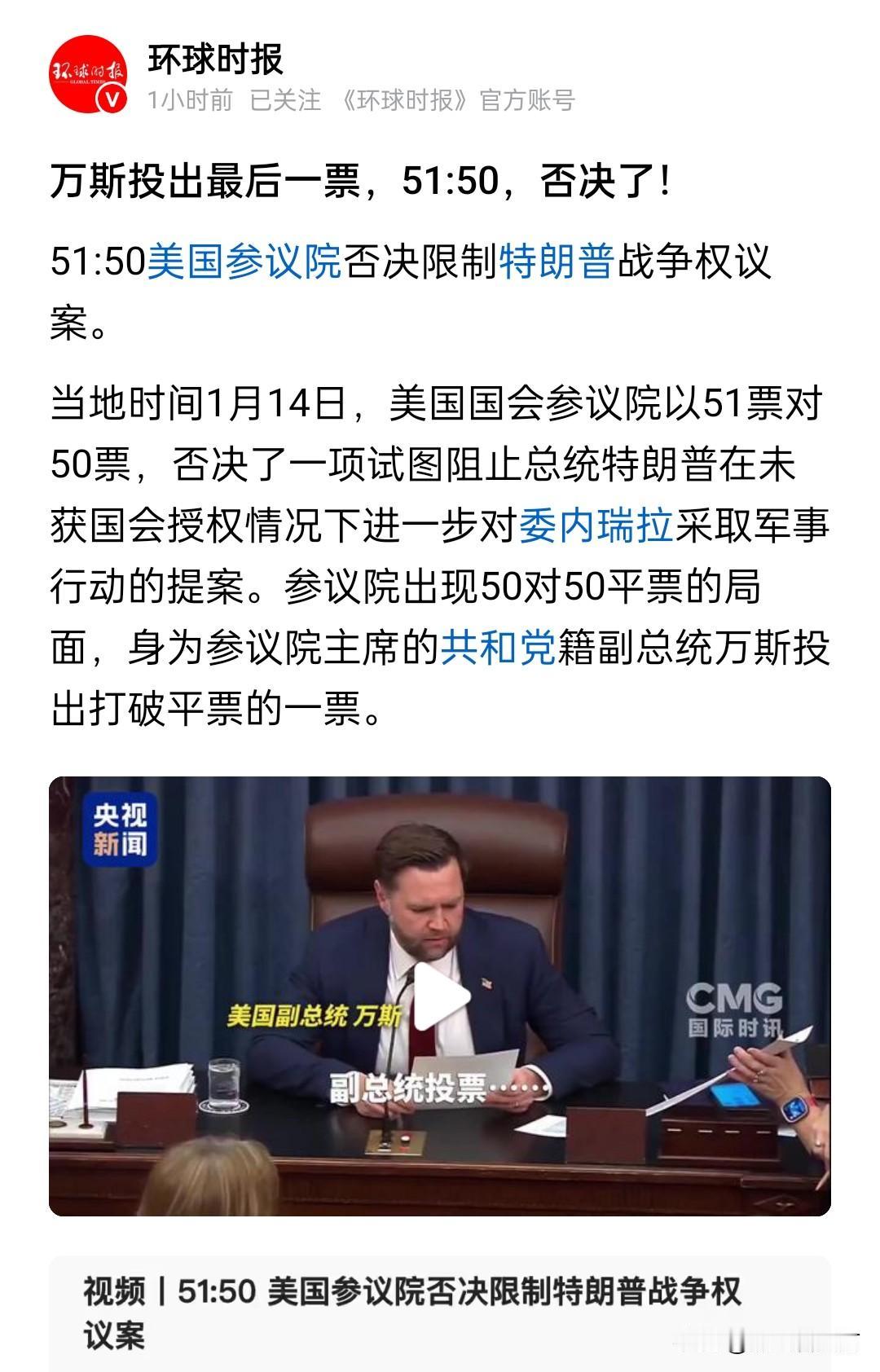 万斯虽然不同意对委内瑞拉采取军事行动,但还是不敢得罪大统领特朗普,关键时刻还是不敢给特朗普削权。