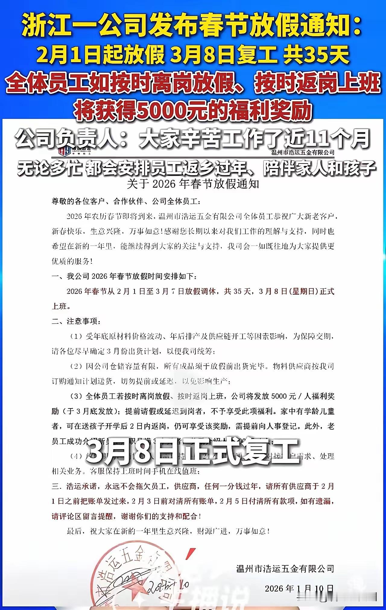 35天假+5000元!这家公司让全网打工人破防:这才是中国好老板? “把这条转发给老板,他回了我一个字:滚!”最近温州一家民企火了,春节放假整整35天,覆盖整个正月,按时回来发5000现金,有娃的还能延迟返岗!消息一出,评论区直接炸了…… 先说他们干了啥: 放假从2月1日放到3月8日,整整一个多月。老板拍板:不扣钱、不调休,回来就奖5000,家里有孩子的员工晚点回来也没关系。这哪是放假?这简直是给打工人的“春运尊享套餐”! 老板说的话更戳心: “钱是赚不完的,但团圆错过一次就少一次。”记者采访老板,他没扯什么狼性文化,反而特实在:“大家辛苦干11个月,不就图个踏实过年吗?员工是人,不是机器成本。” 结果你猜怎么着? 这么“宠”员工,公司不但没垮,反而订单多了、口碑爆了!老员工私下说:“老板真心待我们,谁好意思摸鱼?拼命干都怕对不住这份信任。”你看,尊重换来的根本不是躺平,是死心塌地。 可为什么我们多数人只有羡慕的份? 因为太多公司还在玩“内卷式用工”——年假抠搜算、加班成常态、福利靠画饼。对比之下,这家民企的35天假,像一记耳光,打醒了多少装睡的管理层?这根本不是“福利过剩”,而是顶级商业智慧:把员工当人看,才是稳赚不赔的投资。 说到底,打工人的心酸就一句: 我们要的不是被当成“人力资源”,而是被当作“人”。平时加班熬夜换点钱,不就盼着年关能体面回家、陪陪家人吗?可惜多少老板不懂:扣下的假期、省下的奖金,早晚会变成流失的忠诚、垮掉的口碑。 所以你看,最高明的管理,从不是算计员工,而是成就员工。35天假+5000元,买的是一整年的凝聚力和认同感——这笔账,聪明的老板早算明白了。 你呢?你们公司春节放几天?遇到过这样“人间清醒”的老板吗? 评论区聊聊,也让你老板“不小心”看到~打工人双休 打工人调休 温州老板公司