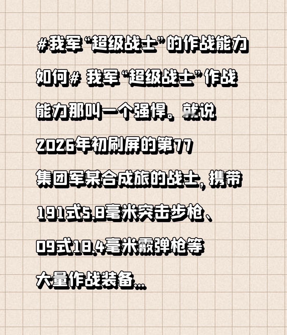 我军“超级战士”作战能力那叫一个强悍。就说2026年初刷屏的第77集团军某合成旅的战士,携带191式5.8毫米突击步枪、09式18.4毫米霰弹枪等大量作战装备,能兼顾远程、近距离、防空、反坦克和侦察等多方面任务,这装备配置在网络游戏里都少见。 往前看,1947年16岁的张国福服役半年就特别英勇,孤身冲到敌军指挥部,用一颗手榴弹让国民党中将赵伯昭等军官投降。1948年辽沈战役,他也发挥重要作用。这些“超级战士”们用实力证明,不管是过去还是现在,我军作战能力都不容小觑。