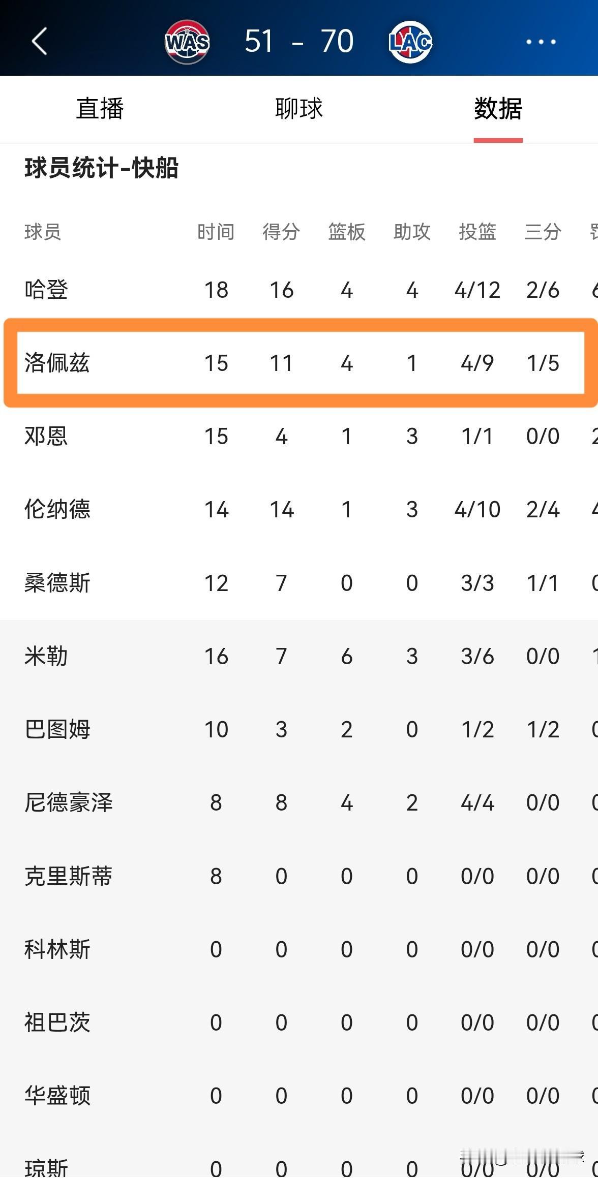 快船老将洛佩兹真是太敢出手了!在今天快船主场迎战奇才的上半场比赛中,顶替祖巴茨首发出战的大洛佩兹竟然出手了9次,他的出手次数高居全队第三。 在前两节比赛中,大洛佩兹首发出战15分钟,投篮9中4,其中三分球5中1、罚球2中2得到11分,还有4篮板1助攻1盖帽,他的场上正负值为+8。 幸运的是奇才的整体实力偏弱,因此快船能够接受大洛佩兹的大量出手,不然的话大洛佩兹的盲目出手一定会伤害到球队。