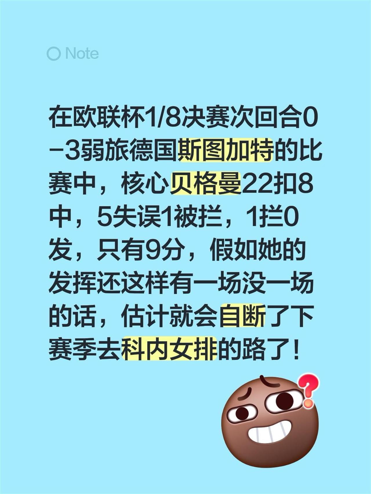 在欧联杯1/8决赛次回合0-3弱旅德国斯图加特的比赛中,核心贝格曼22扣8中,5失误1被拦,1拦0发,只有9分,假如她的发挥还这样有一场没一场的话,估计就会自断了下赛季去科内女排的路了!
