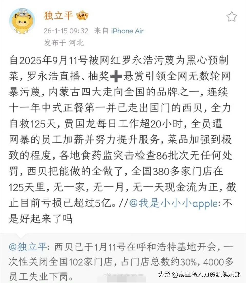 看到西贝的消息,心里真不是滋味。一个干了三十多年、开了380多家店、养活那么多员工的大牌子,说倒就这么倒了?就因为去年9月跟网红的一场骂战,硬生生被拖垮了。 听说老板贾国龙这125天每天干20个小时,给员工加薪、死磕菜品和服务,监管部门查了86次都没问题,能做的全做了。可结果呢?全国没一家店能赚到现金,三个月血亏5个亿,现在直接关掉102家店,4000多个兄弟姐妹一下子没了饭碗。 我们打工的最懂这种无奈。有时候你拼了命想把事情做好,但一句话、一波网暴,就能让所有努力白费。老贾说自己犯了三个错:不该接茬、不该说狠话、不该忽略了咱们顾客的声音。现在他账号清空、靠吃药睡觉,58岁的人备好了两条路:要么回内蒙老家,要么带着牌子去国外试试。 这事给所有做生意的老板都上了一课:口碑这东西,挣起来难,毁起来太容易了。只是可惜了那几千个员工,还有这个曾经挺让人骄傲的民族品牌。 子弹还在飞,但落到普通人身上,就是实实在在的生活压力啊。