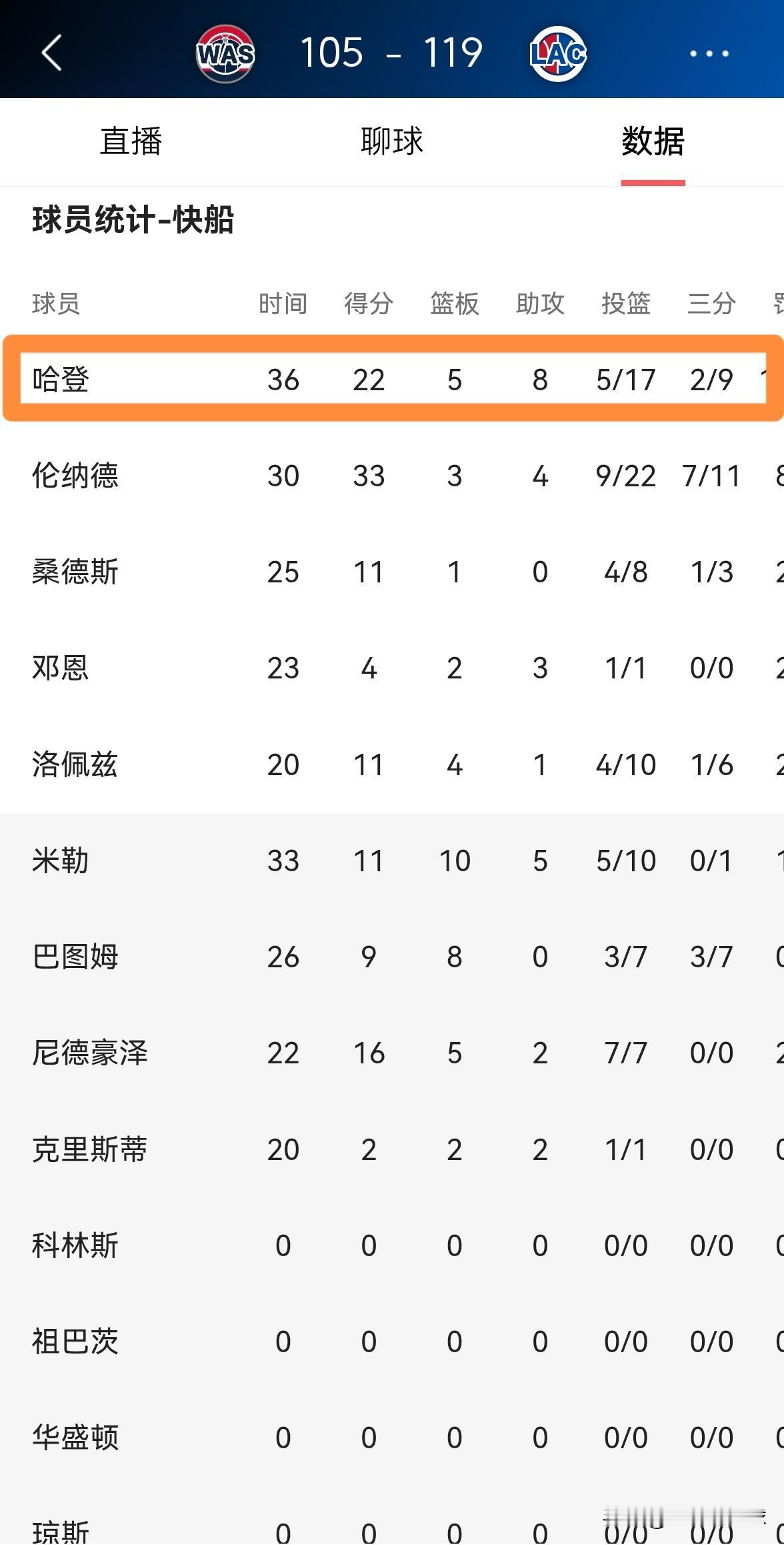 我真的已经习惯了快船球星哈登的拉胯!在今天快船主场以119:105击败奇才的比赛中,哈登的进攻效率真是低的可怜,他在首发出战的36分钟里,投篮17中5,其中三分球9中2、罚球10中10非常低效的得到22分,还有2次失误,他的场上正负值为+1。 有时候我真的搞不懂哈登的出手选择,既然明明知道自己投篮手感冰凉,为什么还要出手那么多次?