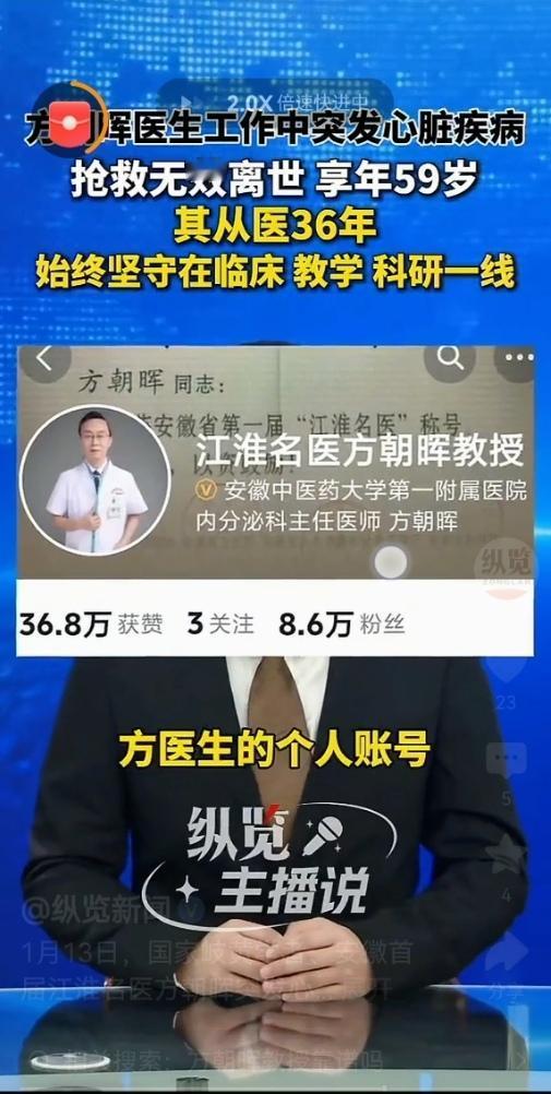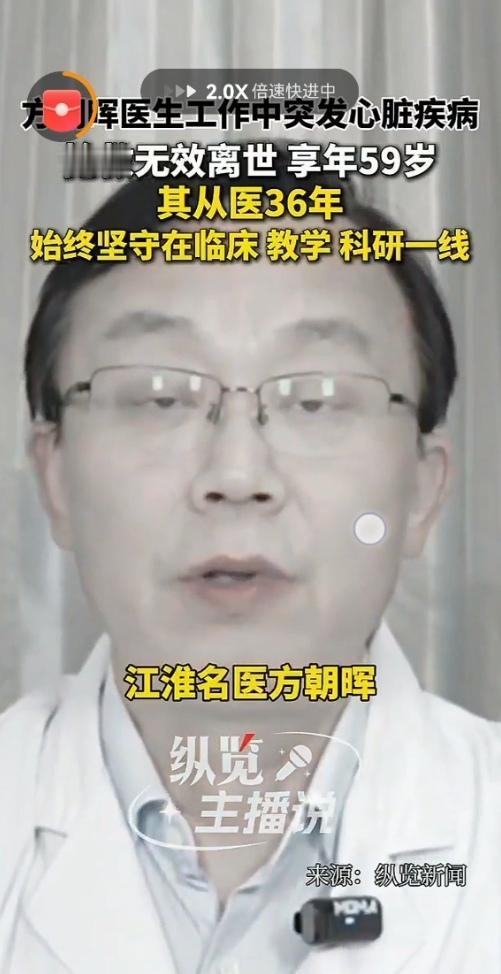 59岁医生博士方朝晖去世 去世前还在网上普及医学知识 去世原因是 工作时间突发心脏病。 这位59岁的医生博士,方朝晖,曾是无数患者心中的“白衣天使”,也是医学界的“活字典”。他用毕生的精力,默默守护着生命的尊严,用知识点亮无数人的希望。可是谁又能想到,这样一位充满热情、满腔仁爱的医生,竟会在如此年轻的年纪,离开这个世界?更令人惋惜的是,他的离去,似乎还带着一丝未竟的使命。 方朝晖博士生前,最热衷的事情之一,就是在网络上普及医学知识。他用通俗易懂的语言,打破了医学的高墙,让普通人也能理解身体的奥秘,学会自我保健。有人说,他是在用“知识的力量”拯救更多生命。的确,他的文章、视频、讲座,深受网友喜爱,成为许多家庭的健康“宝典”。然而,就在他用心传递健康理念的同时,谁又能想到,命运竟如此残酷。 那天,他刚刚结束一场线上讲座,依然精神抖擞,似乎没有任何预兆。突然间,工作繁忙的他,突发心脏病倒在了办公室里。尽管抢救及时,但最终还是没能挽回他的生命。这个消息像一颗重磅炸弹,瞬间在网络上炸开了锅。网友们哀叹、惋惜、愤怒:为什么这样一位热心公益、充满正能量的医生,竟会在最应该享受晚年、继续造福的年纪,突然离开?有人质问:工作压力是不是太大?有人反思:我们的医疗环境,是否还需要更人性化的呵护? 其实,方博士的离世,折射出一个深刻的社会问题,长时间的高强度工作,正在吞噬太多人的健康。医生、教师、科研人员……他们在岗位上拼尽全力,却常常被忽视了最基本的健康需求。我们常说“敬业”,但难道“敬业”就意味着牺牲自己的生命?这个问题,值得每个人深思。 更令人感慨的是,方朝晖的离去,仿佛在提醒我们:生命的脆弱和宝贵,不能被忽视。也许我们更应该反思,如何在追求事业的同时,守护好自己的健康。毕竟,没有什么比生命更重要,没有什么比健康更宝贵。 他用生命践行了“传递知识、关爱生命”的初心,也用离去告诉我们:珍惜当下,关爱自己和身边的人。希望他的精神,能成为激励我们每一个人的力量,让我们在追梦的路上,也不忘照顾好自己。愿他安息,也愿我们都能在生命的每一天,活得更有意义、更有温度。 你对这场突如其来的离别,有什么样的感悟?是否也曾在忙碌中忽略了健康?欢迎留言分享你的看法,让我们共同反思,共同守护那份宝贵的生命之光。医生逝世 专家去世