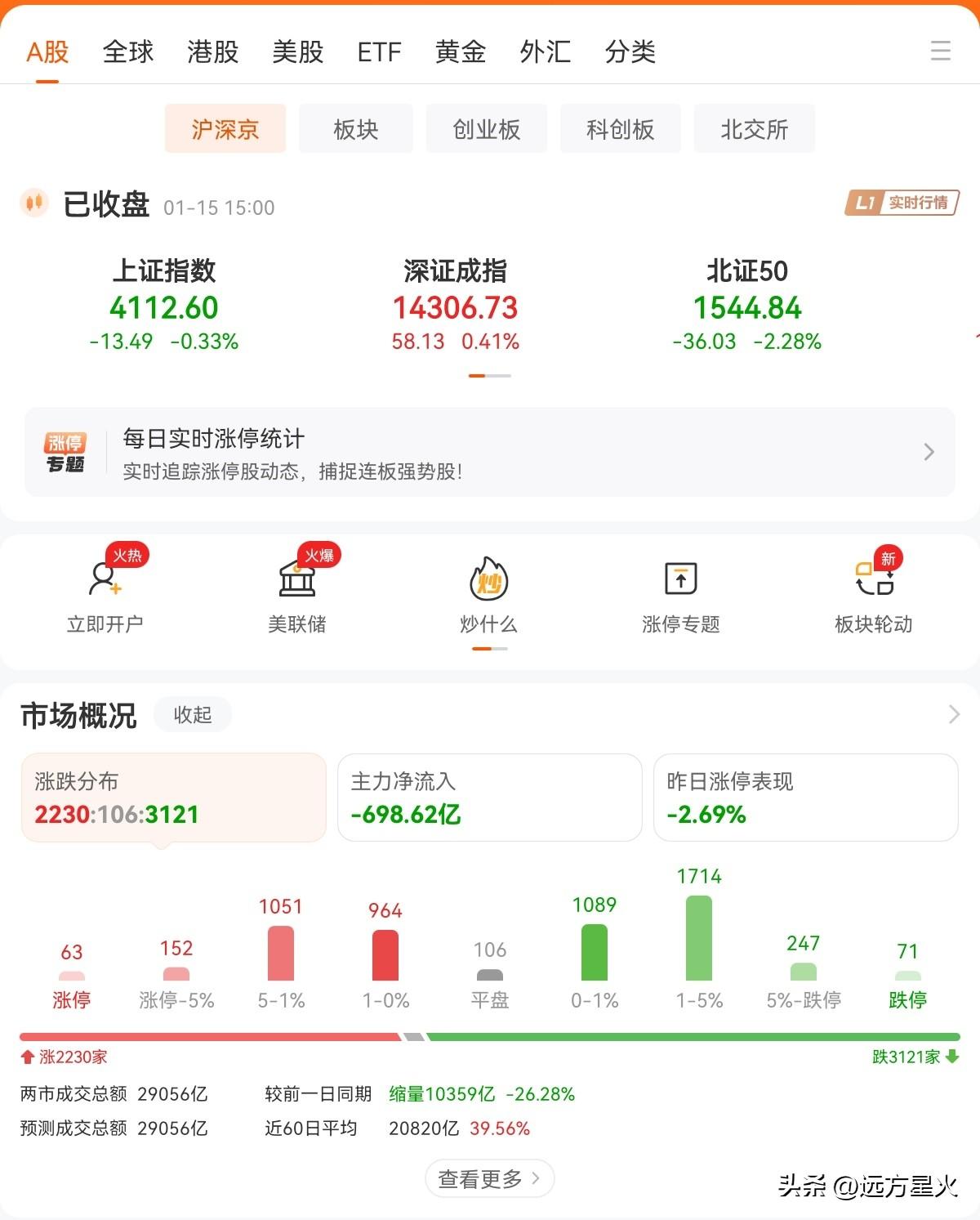 明日A股应对 今天的走势从盘面来看,除了上午冲高翻红了一会,其他时间基本都是在水下弱势震荡,昨日管理层开始降温股市热度,今天的成交量相对昨天锐减一万亿,感觉一下冰火两重天啊。 没有量向上攻肯定攻不上去,后面大概率大盘指数会在4100点左右震荡拉扯,等时间盘整够了才会选择方向,也就是接下来到过年以前没什么大的行情了。 大盘永远只是给自己参考的工具,我们更应该多关注自己手里的股票,做好高抛低吸。大盘虽然不会出现大的波动,但是指数稳在那里,板块间会不断轮动,手中没有涨过或者没有涨多少的股票,等着就好了,千万别想着换到前一段时间看起来涨得非常猛的板块和个股。 相对来说,我更喜欢震荡行情,今天是接筹码的一天,明天大概率会有一个弱反弹,后续依然会继续执行“涨了卖点,跌了买点;大涨大卖,大跌大买”的节奏。